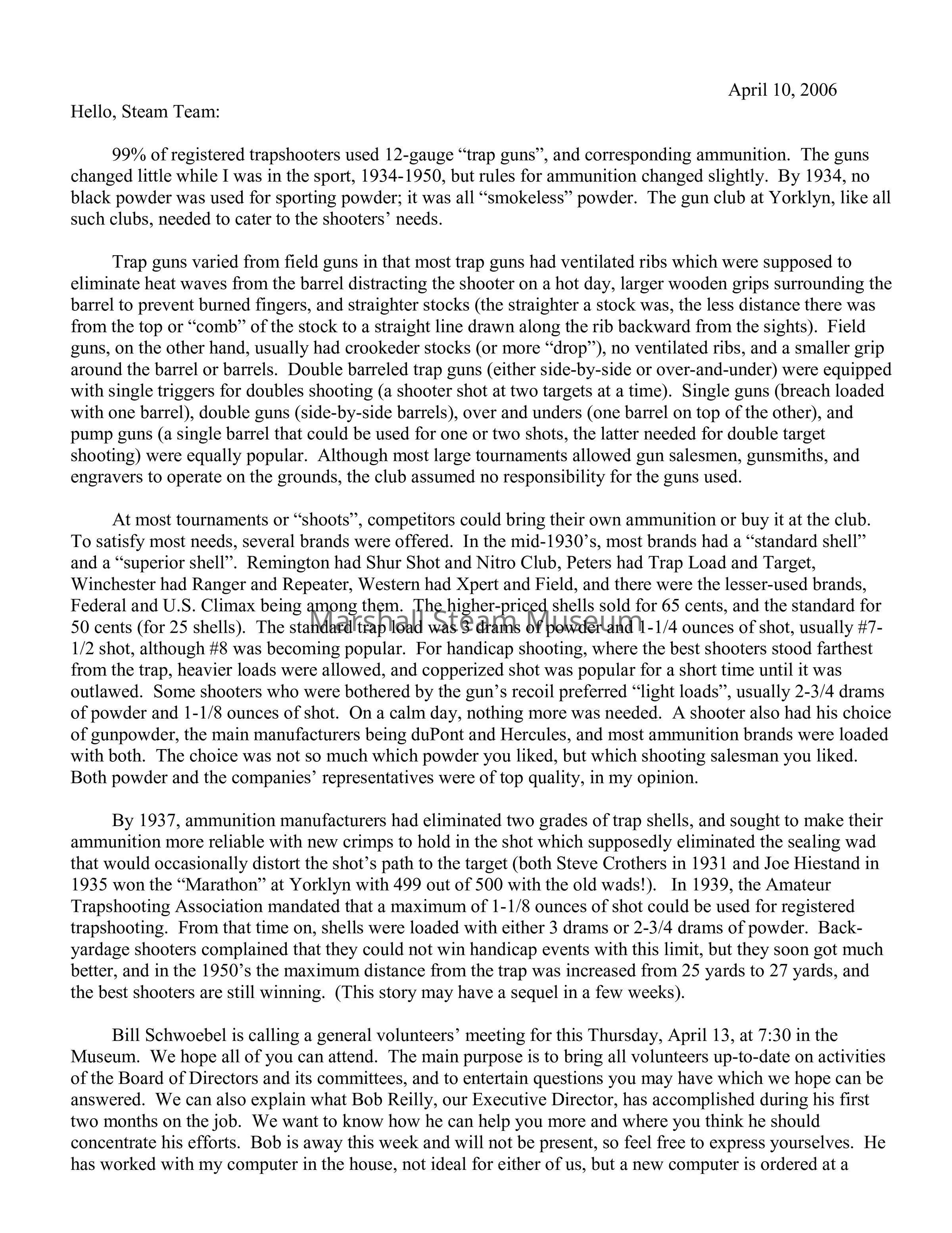 99% of registered trapshooters used 12-gauge “trap guns”, and corresponding ammunition. The guns changed little while I was in the sport, 1934-1950, but rules for ammunition changed slightly. By 1934, no black powder was used for sporting powder; it was all “smokeless” powder. The gun club at Yorklyn, like all such clubs, needed to cater to the shooters’ needs.