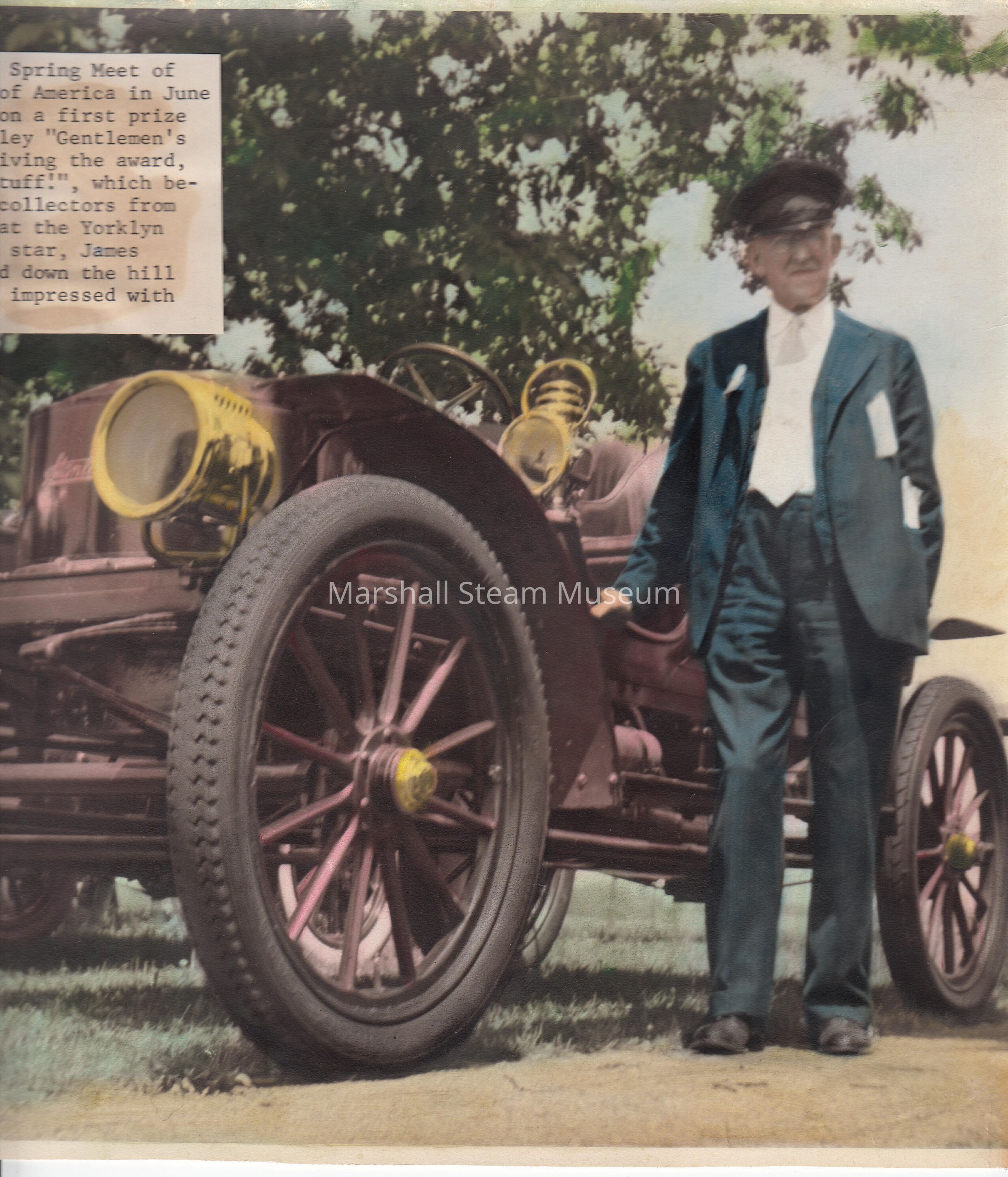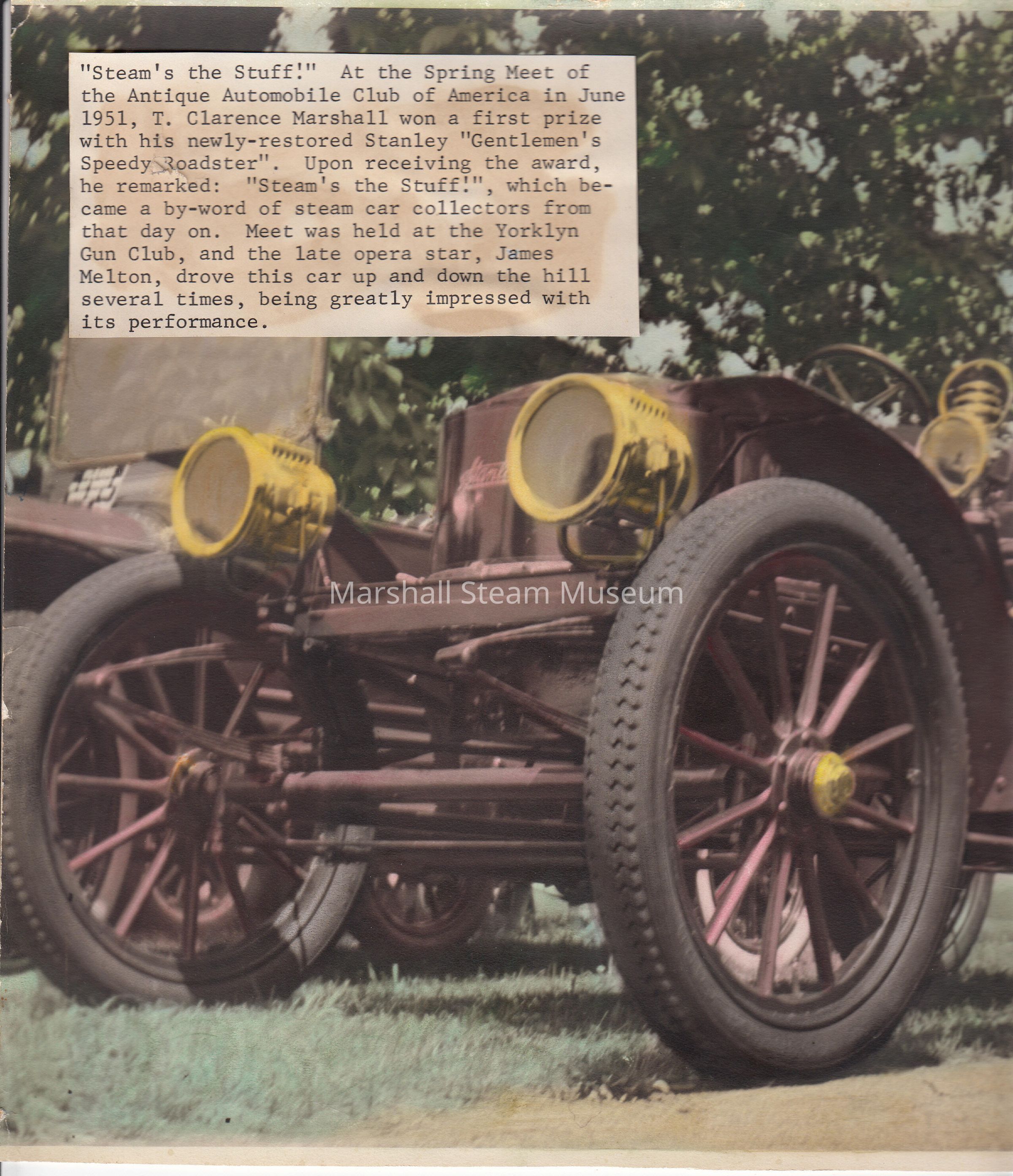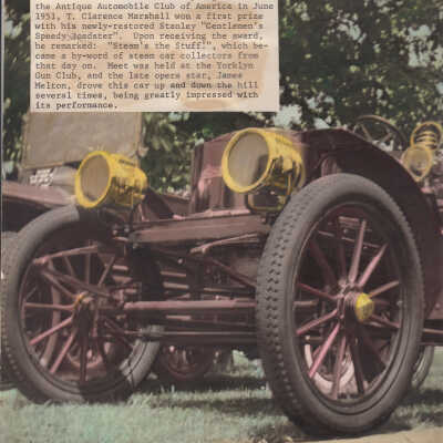 Front Writing: "'Steam's the Stuff.' At the Spring Meet of the Antique Automobile Club of America in June 1951, T. Clarence Marshall won a first prize with his newly-restored Stanley 'Gentleman's Speedy Roadster'. Upon receiving the award, he remarked: 'Steam's the Stuff.', which became a by-word of steam car collectors from that day on. Meet was held at the Yorklyn Gun Club, and the late opera star, James Melton, drove this car up and down the hill several times, being greatly impressed with its performance."Photograph Details