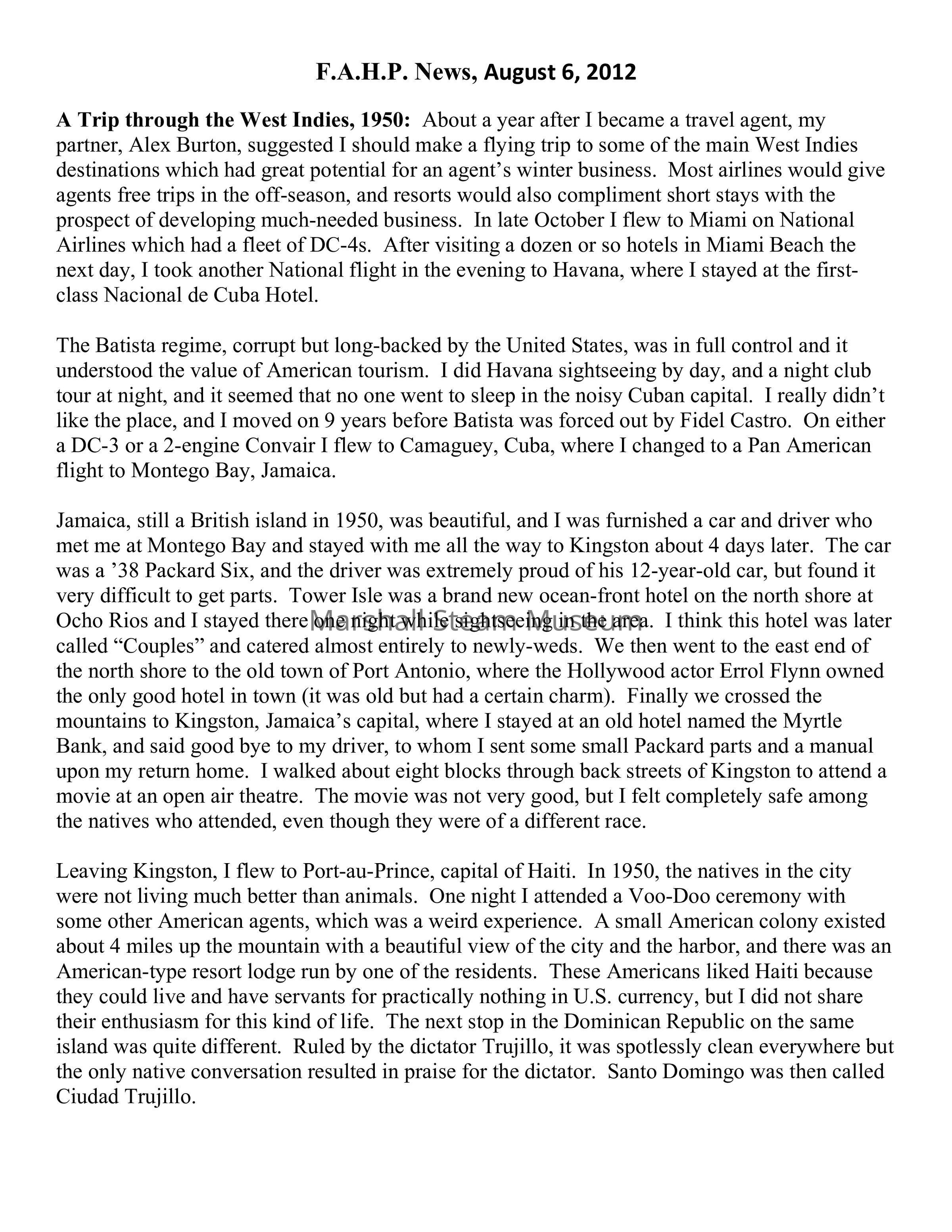 A Trip through the West Indies, 1950: About a year after I became a travel agent, my partner, Alex Burton, suggested I should make a flying trip to some of the main West Indies destinations which had great potential for an agent’s winter business. Most airlines would give agents free trips in the off-season, and resorts would also compliment short stays with the prospect of developing much-needed business. In late October I flew to Miami on National Airlines which had a fleet of DC-4s. After visiting a dozen or so hotels in Miami Beach the next day, I took another National flight in the evening to Havana, where I stayed at the first-class Nacional de Cuba Hotel.