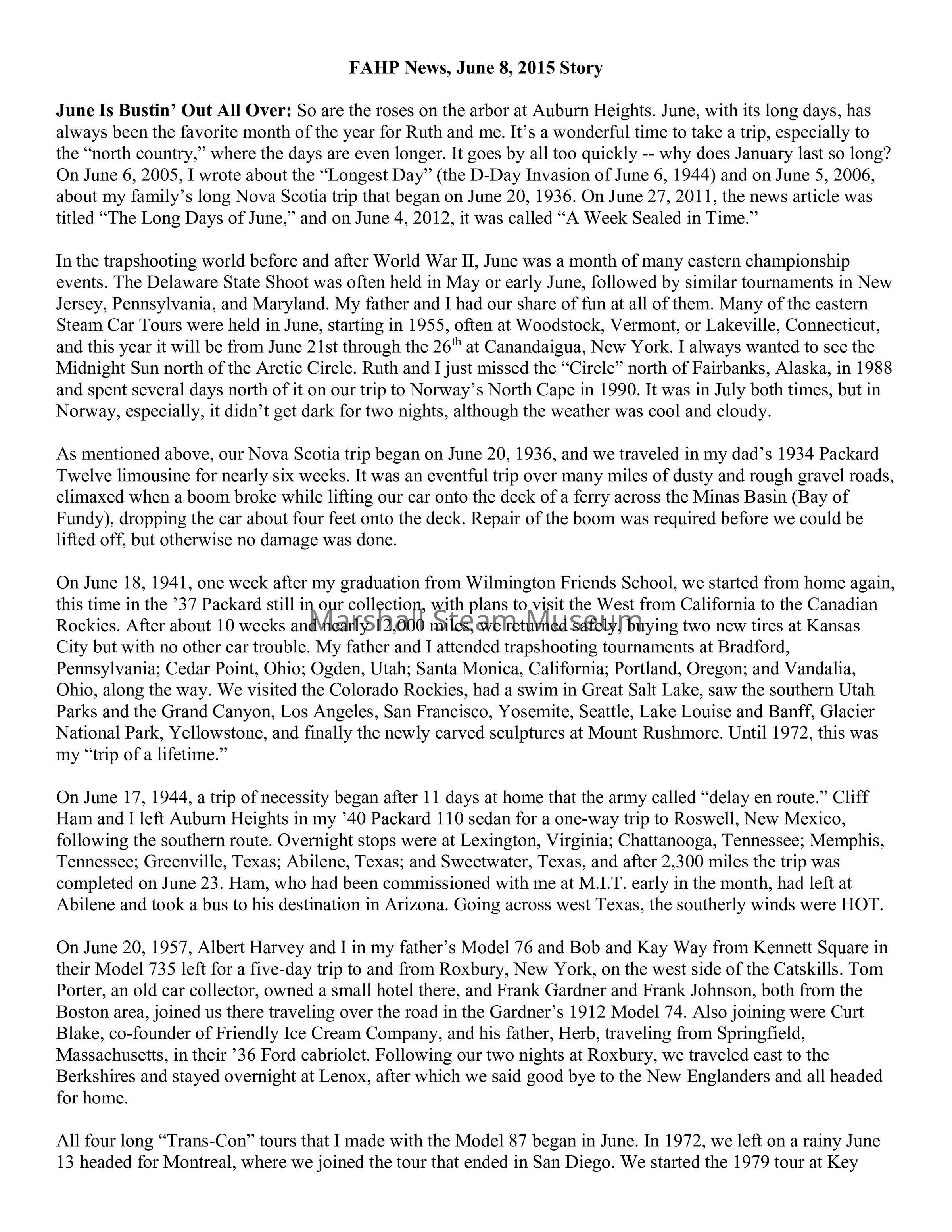 In the trapshooting world before and after World War II, June was a month of many eastern championship events. The Delaware State Shoot was often held in May or early June, followed by similar tournaments in New Jersey, Pennsylvania, and Maryland. My father and I had our share of fun at all of them. Many of the eastern Steam Car Tours were held in June, starting in 1955, often at Woodstock, Vermont, or Lakeville, Connecticut, and this year it will be from June 21st through the 26th at Canandaigua, New York. I always wanted to see the Midnight Sun north of the Arctic Circle. Ruth and I just missed the “Circle” north of Fairbanks, Alaska, in 1988 and spent several days north of it on our trip to Norway’s North Cape in 1990. It was in July both times, but in Norway, especially, it didn’t get dark for two nights, although the weather was cool and cloudy.