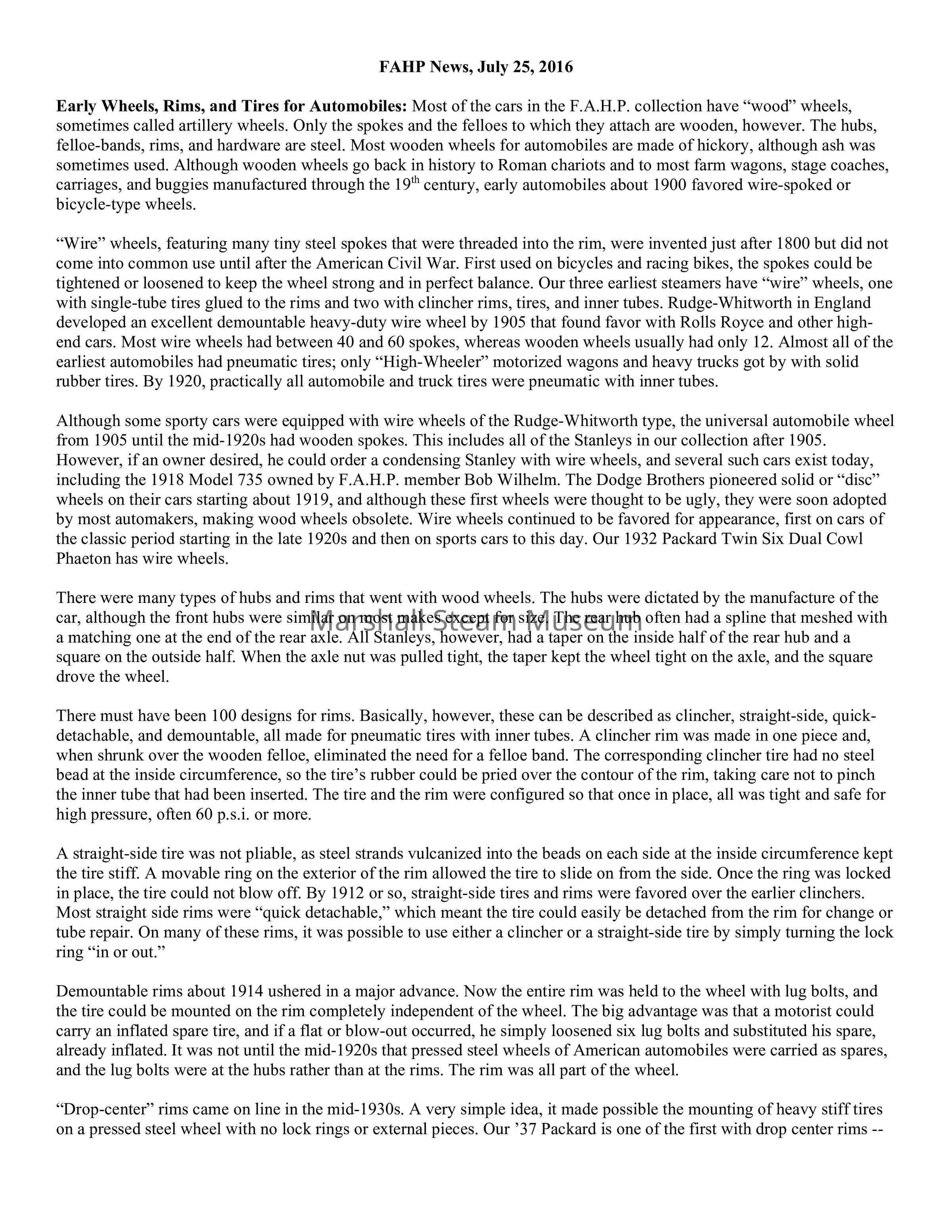Early Wheels, Rims, and Tires for Automobiles: Most of the cars in the F.A.H.P. collection have “wood” wheels, sometimes called artillery wheels. Only the spokes and the felloes to which they attach are wooden, however. The hubs, felloe-bands, rims, and hardware are steel. Most wooden wheels for automobiles are made of hickory, although ash was sometimes used. Although wooden wheels go back in history to Roman chariots and to most farm wagons, stage coaches, carriages, and buggies manufactured through the 19th century, early automobiles about 1900 favored wire-spoked or bicycle-type wheels.