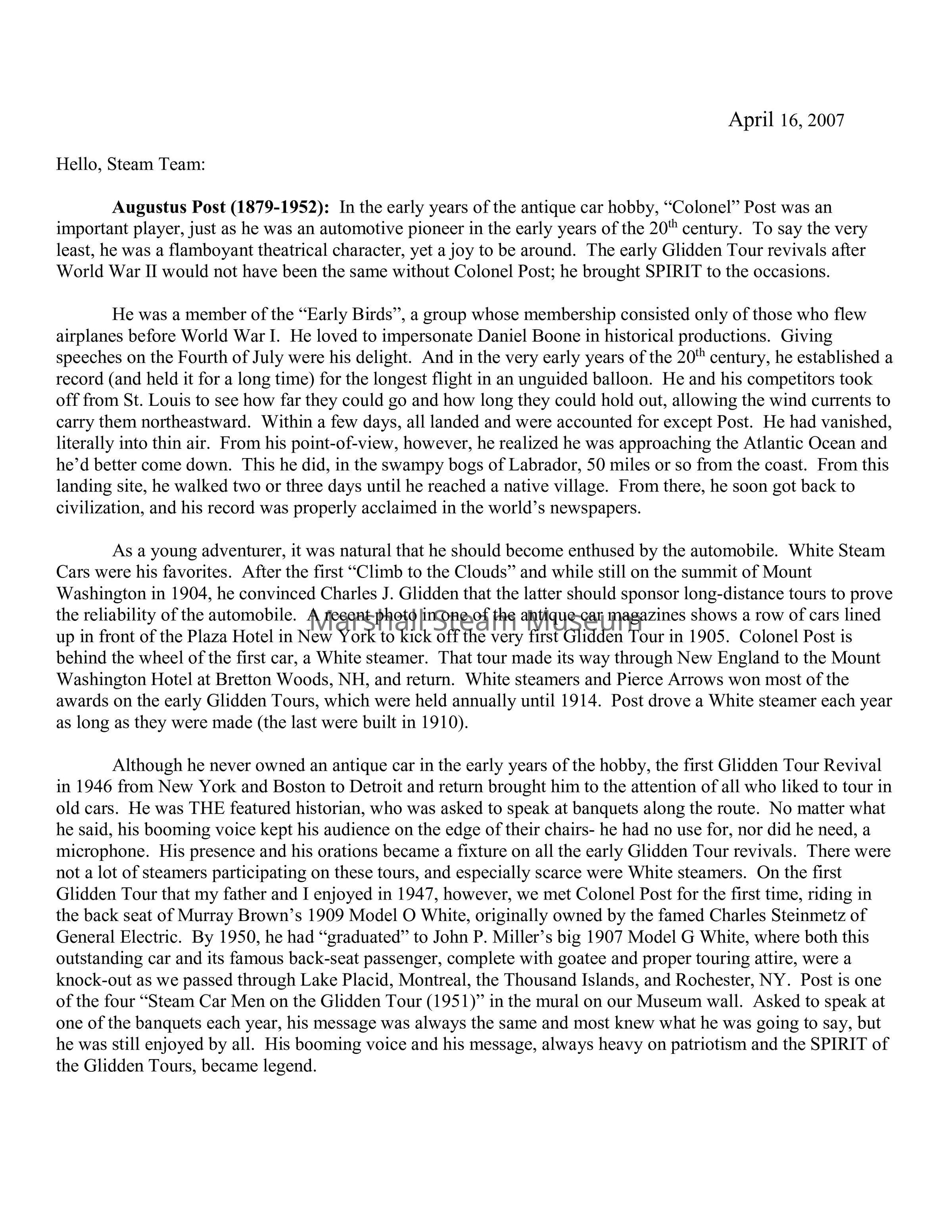 Although he never owned an antique car in the early years of the hobby, the first Glidden Tour Revival in 1946 from New York and Boston to Detroit and return brought him to the attention of all who liked to tour in old cars. He was THE featured historian, who was asked to speak at banquets along the route. No matter what he said, his booming voice kept his audience on the edge of their chairs- he had no use for, nor did he need, a microphone. His presence and his orations became a fixture on all the early Glidden Tour revivals. There were not a lot of steamers participating on these tours, and especially scarce were White steamers. On the first Glidden Tour that my father and I enjoyed in 1947, however, we met Colonel Post for the first time, riding in the back seat of Murray Brown’s 1909 Model O White, originally owned by the famed Charles Steinmetz of General Electric. By 1950, he had “graduated” to John P. Miller’s big 1907 Model G White, where both this outstanding car and its famous back-seat passenger, complete with goatee and proper touring attire, were a knock-out as we passed through Lake Placid, Montreal, the Thousand Islands, and Rochester, NY. Post is one of the four “Steam Car Men on the Glidden Tour (1951)” in the mural on our Museum wall. Asked to speak at one of the banquets each year, his message was always the same and most knew what he was going to say, but he was still enjoyed by all. His booming voice and his message, always heavy on patriotism and the SPIRIT of the Glidden Tours, became legend.