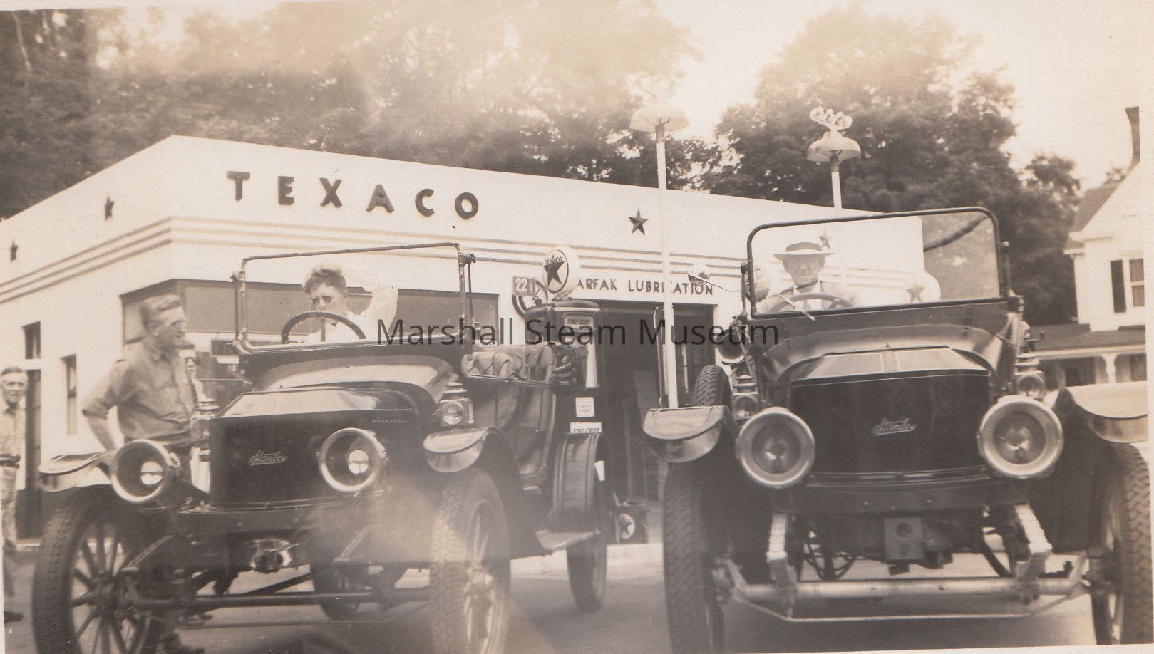 Label: "Our Model 607 with Tom Marshall, driver, left, and Model 76 (the Becker car), with his father the driver, right, stopping for water returning from the first-ever steam car tour returning from the first-ever steam car tour at Charlemont, MA, in July, 1948.