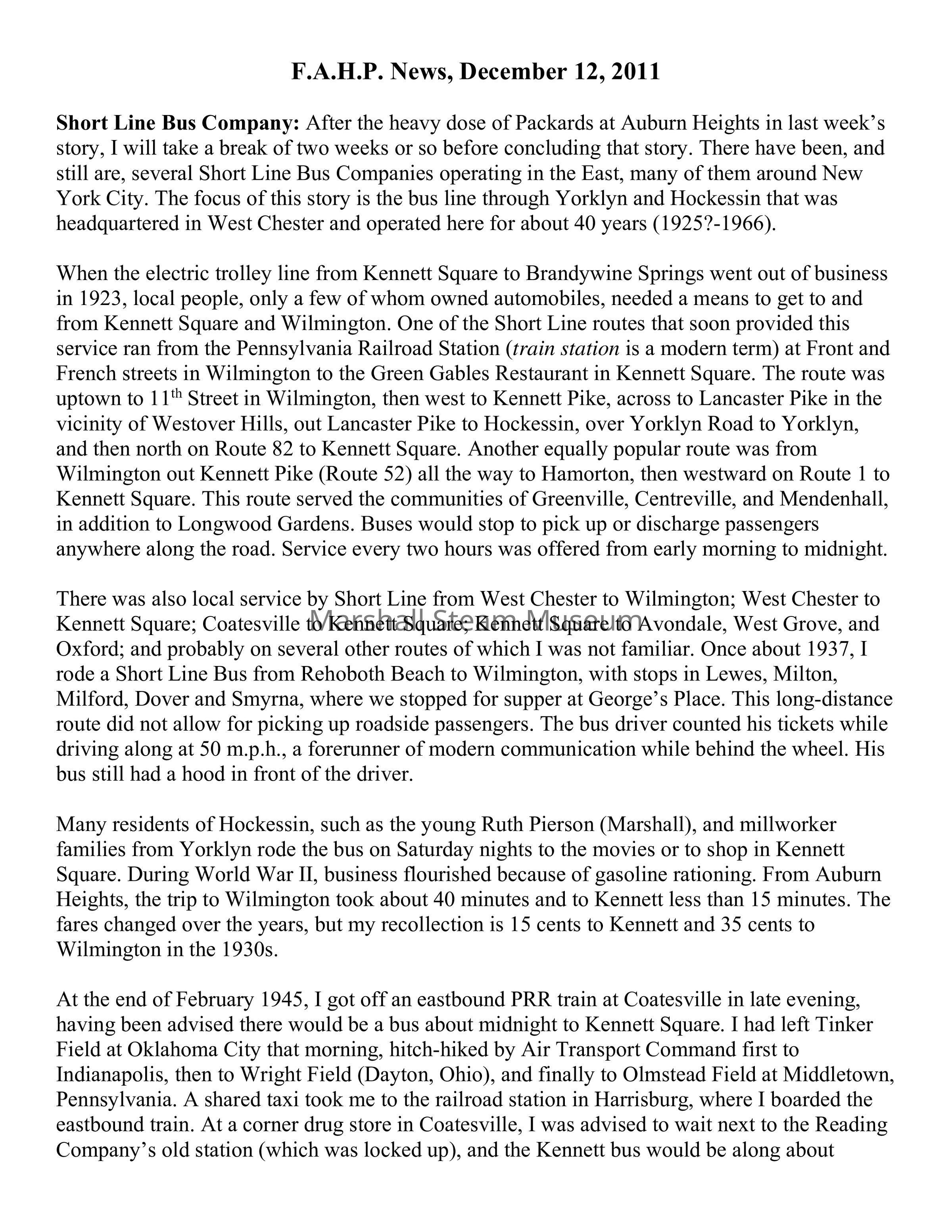 Short Line Bus Company: After the heavy dose of Packards at Auburn Heights in last week’s story, I will take a break of two weeks or so before concluding that story. There have been, and still are, several Short Line Bus Companies operating in the East, many of them around New York City. The focus of this story is the bus line through Yorklyn and Hockessin that was headquartered in West Chester and operated here for about 40 years (1925?-1966).