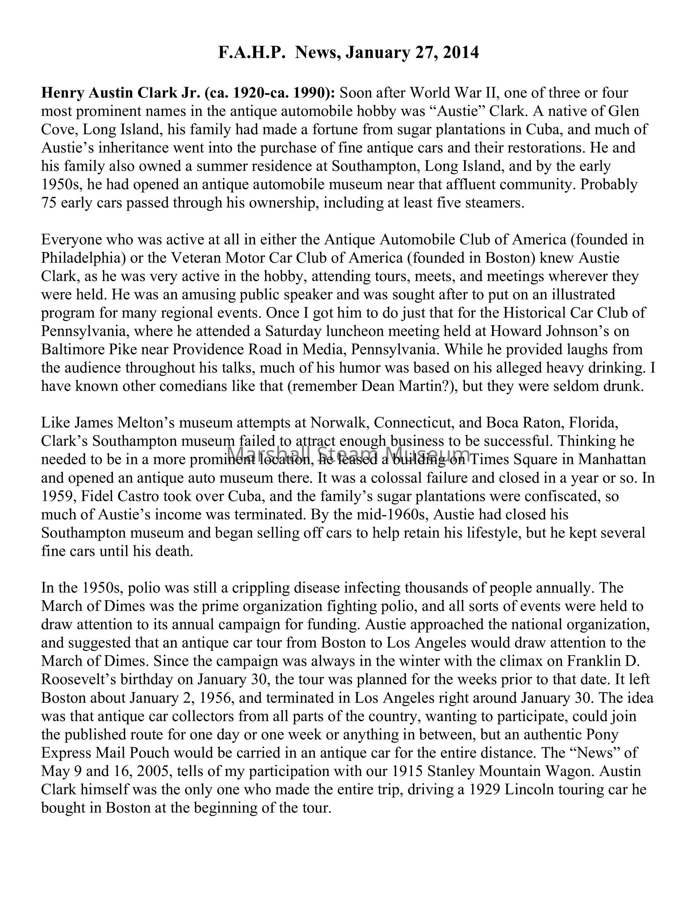 Henry Austin Clark Jr. (ca. 1920-ca. 1990): Soon after World War II, one of three or four most prominent names in the antique automobile hobby was “Austie” Clark. A native of Glen Cove, Long Island, his family had made a fortune from sugar plantations in Cuba, and much of Austie’s inheritance went into the purchase of fine antique cars and their restorations. He and his family also owned a summer residence at Southampton, Long Island, and by the early 1950s, he had opened an antique automobile museum near that affluent community. Probably 75 early cars passed through his ownership, including at least five steamers.