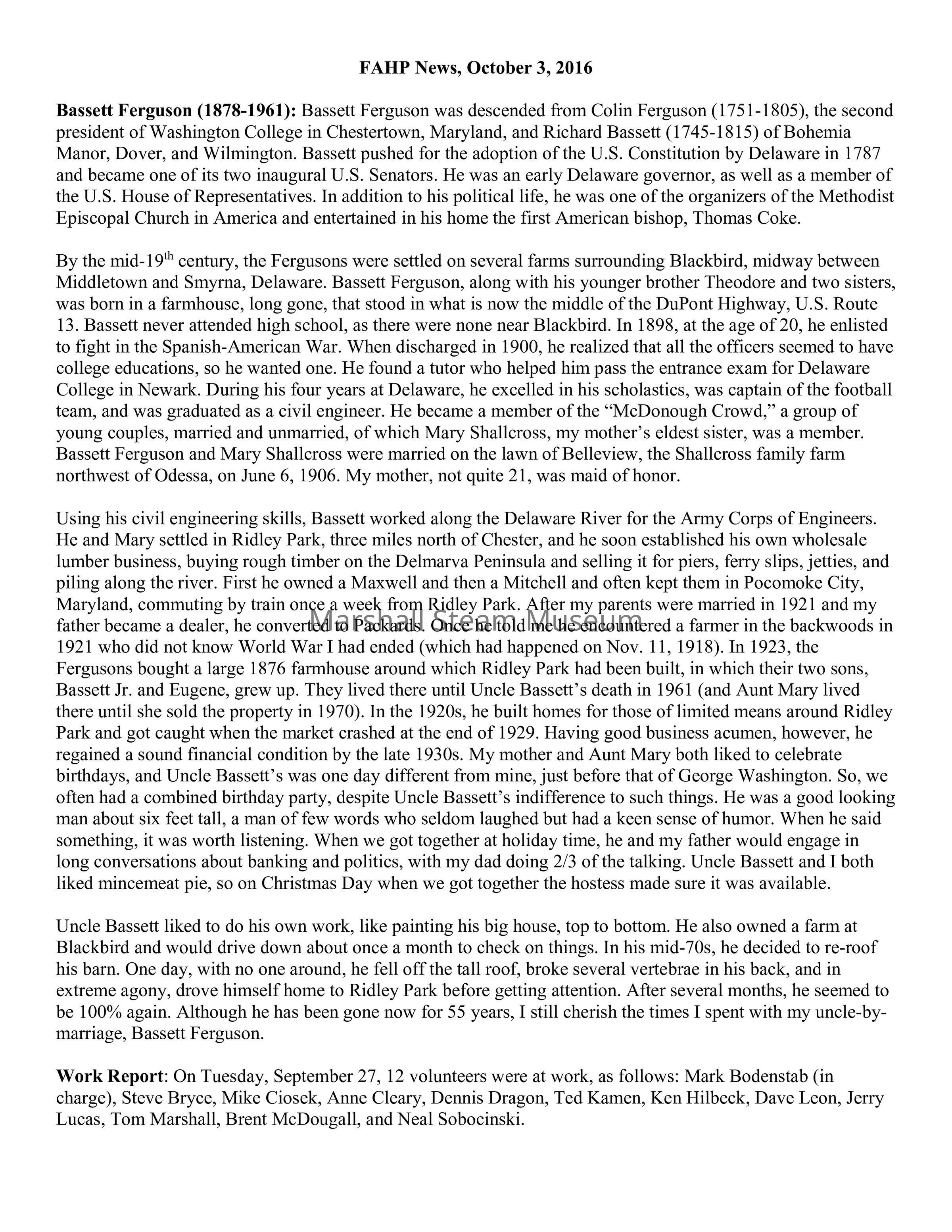 Uncle Bassett liked to do his own work, like painting his big house, top to bottom. He also owned a farm at Blackbird and would drive down about once a month to check on things. In his mid-70s, he decided to re-roof his barn. One day, with no one around, he fell off the tall roof, broke several vertebrae in his back, and in extreme agony, drove himself home to Ridley Park before getting attention. After several months, he seemed to be 100% again. Although he has been gone now for 55 years, I still cherish the times I spent with my uncle-by-marriage, Bassett Ferguson.