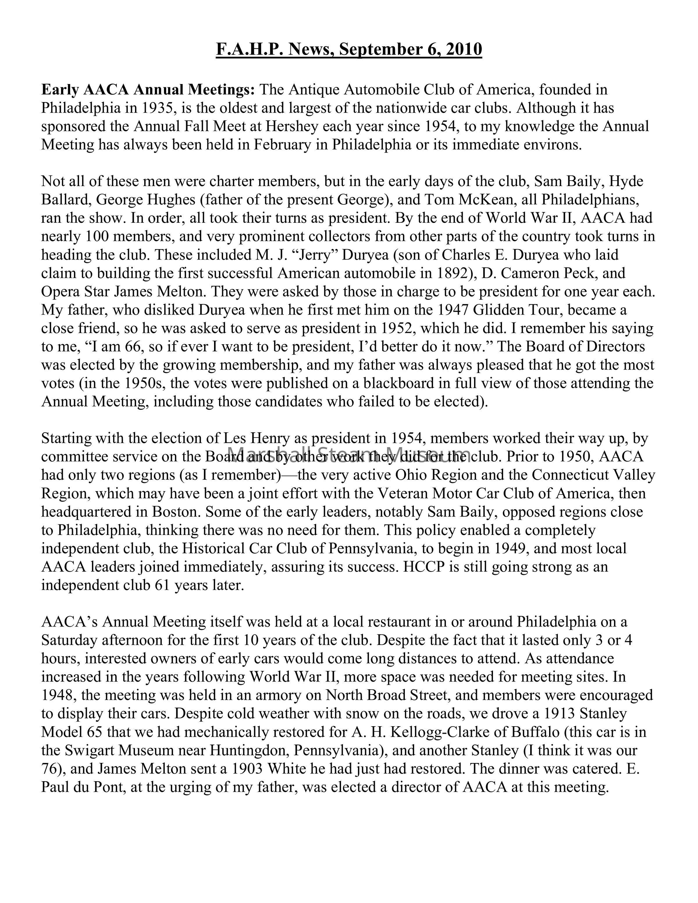 Early AACA Annual Meetings: The Antique Automobile Club of America, founded in Philadelphia in 1935, is the oldest and largest of the nationwide car clubs. Although it has sponsored the Annual Fall Meet at Hershey each year since 1954, to my knowledge the Annual Meeting has always been held in February in Philadelphia or its immediate environs.