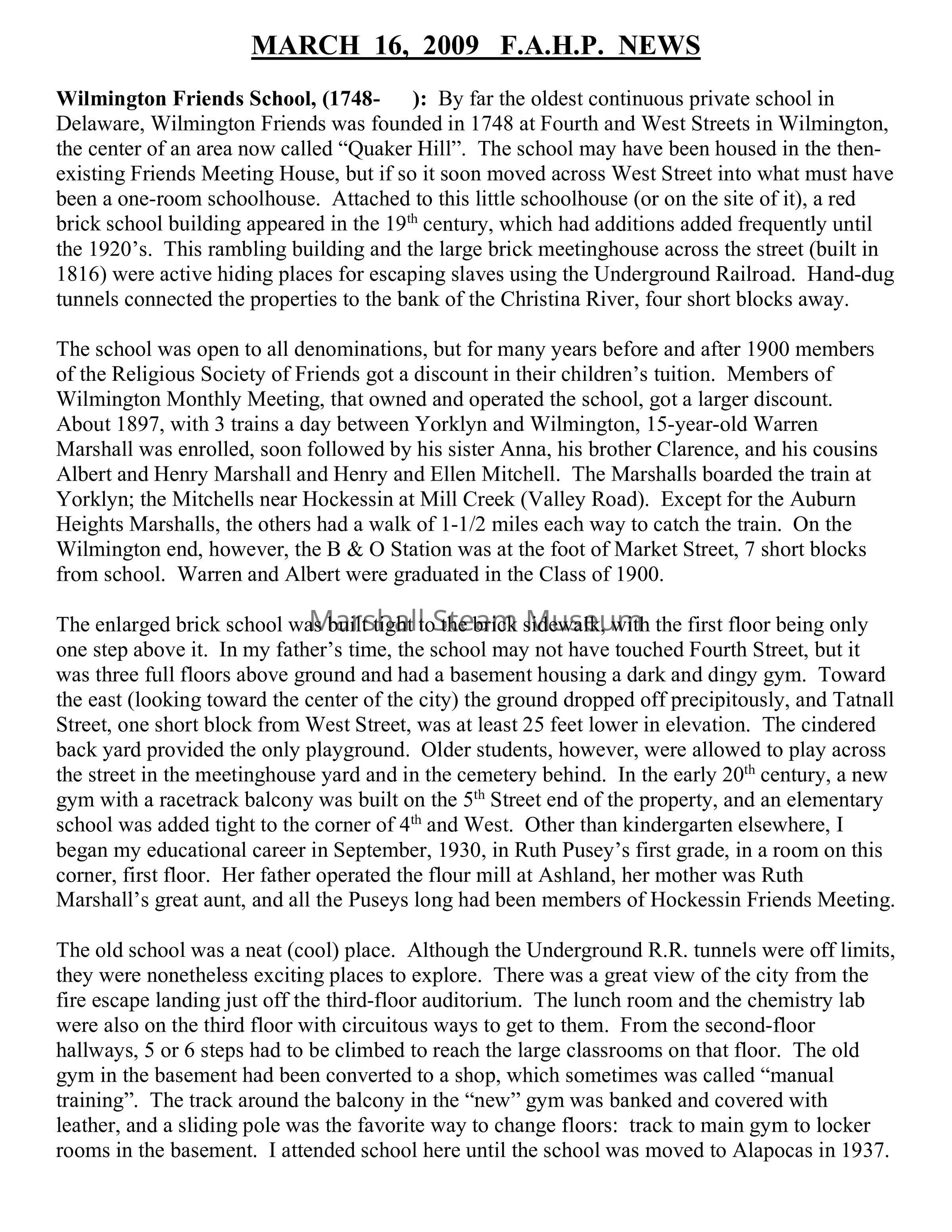 The school was open to all denominations, but for many years before and after 1900 members of the Religious Society of Friends got a discount in their children’s tuition. Members of Wilmington Monthly Meeting, that owned and operated the school, got a larger discount. About 1897, with 3 trains a day between Yorklyn and Wilmington, 15-year-old Warren Marshall was enrolled, soon followed by his sister Anna, his brother Clarence, and his cousins Albert and Henry Marshall and Henry and Ellen Mitchell. The Marshalls boarded the train at Yorklyn; the Mitchells near Hockessin at Mill Creek (Valley Road). Except for the Auburn Heights Marshalls, the others had a walk of 1-1/2 miles each way to catch the train. On the Wilmington end, however, the B & O Station was at the foot of Market Street, 7 short blocks from school. Warren and Albert were graduated in the Class of 1900.