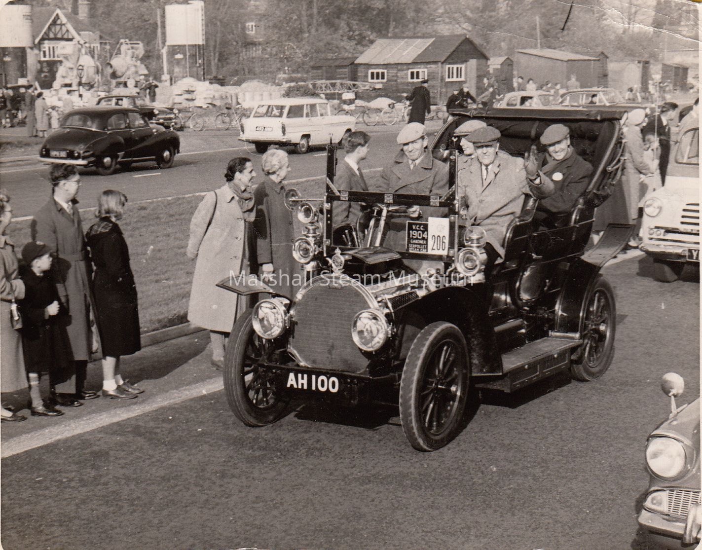Photo caption: "London to Brighton run Nov 1960 Tom Marshall in front seat of 1904 Gardiner-Serpollet Steamer driven by the owner W. Milligan."