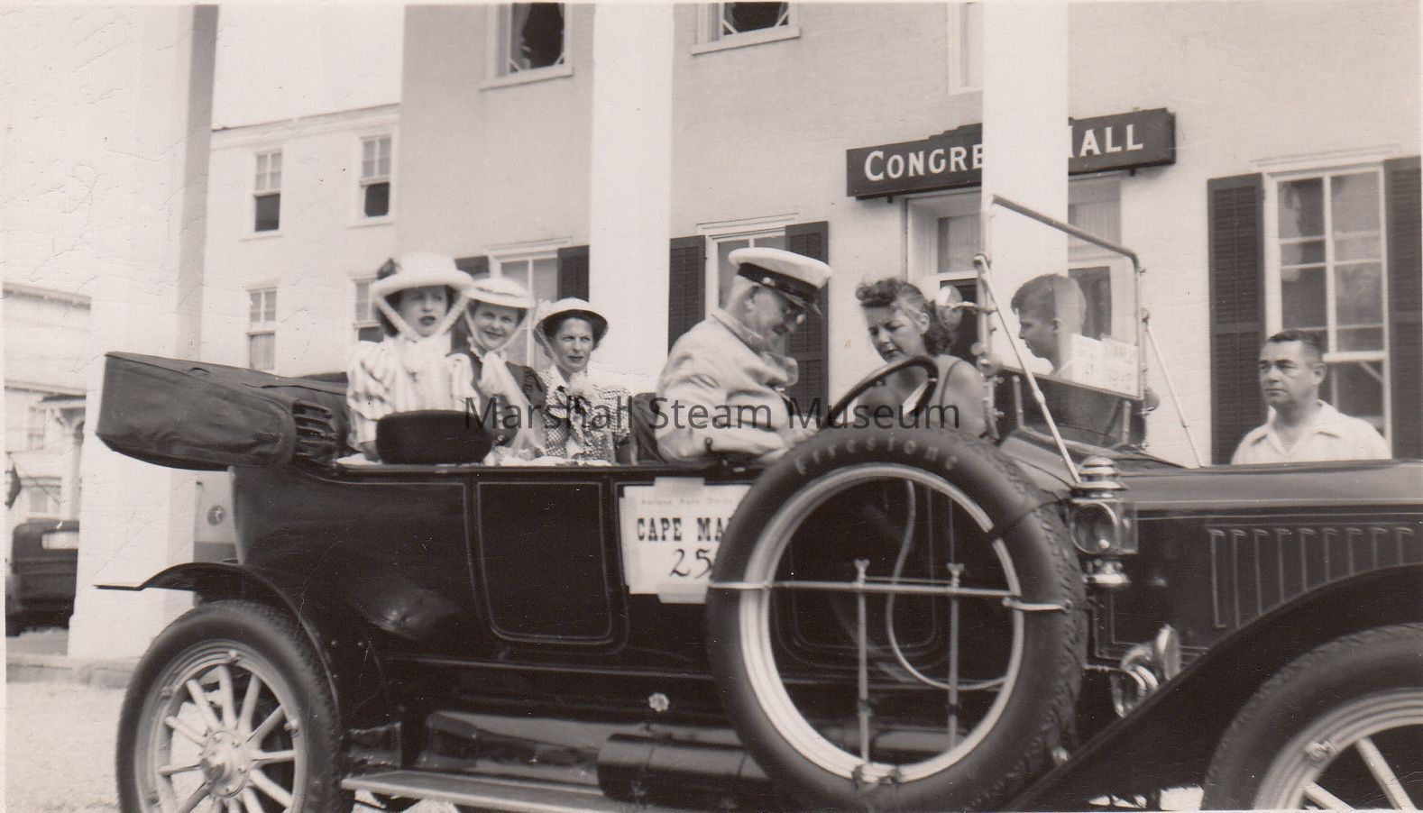 T Clarence Marshall with the 1912 Stanley Touring Model 87 in Cape May, NJ, in 1952 driving car three women in backseat. Woman and two men looking at car.Photograph Details