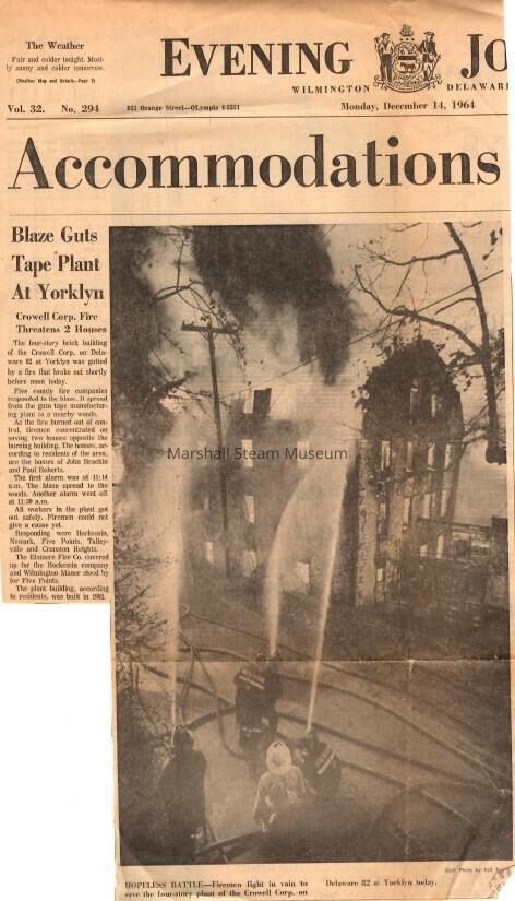Clipping from the December 14, 1964, Wilmington (DE) Evening Journal regarding the Crowell Tape Mill fireGeneral Notes