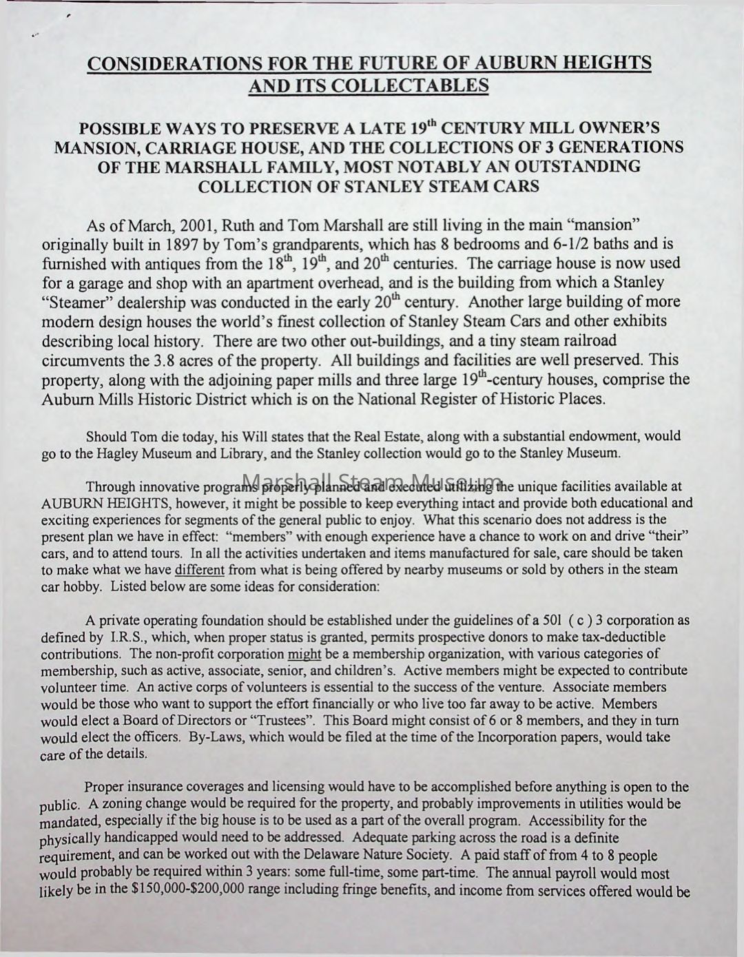 Planning document written by Tom Marshall with ideas on how Auburn Heights might be used after his death.