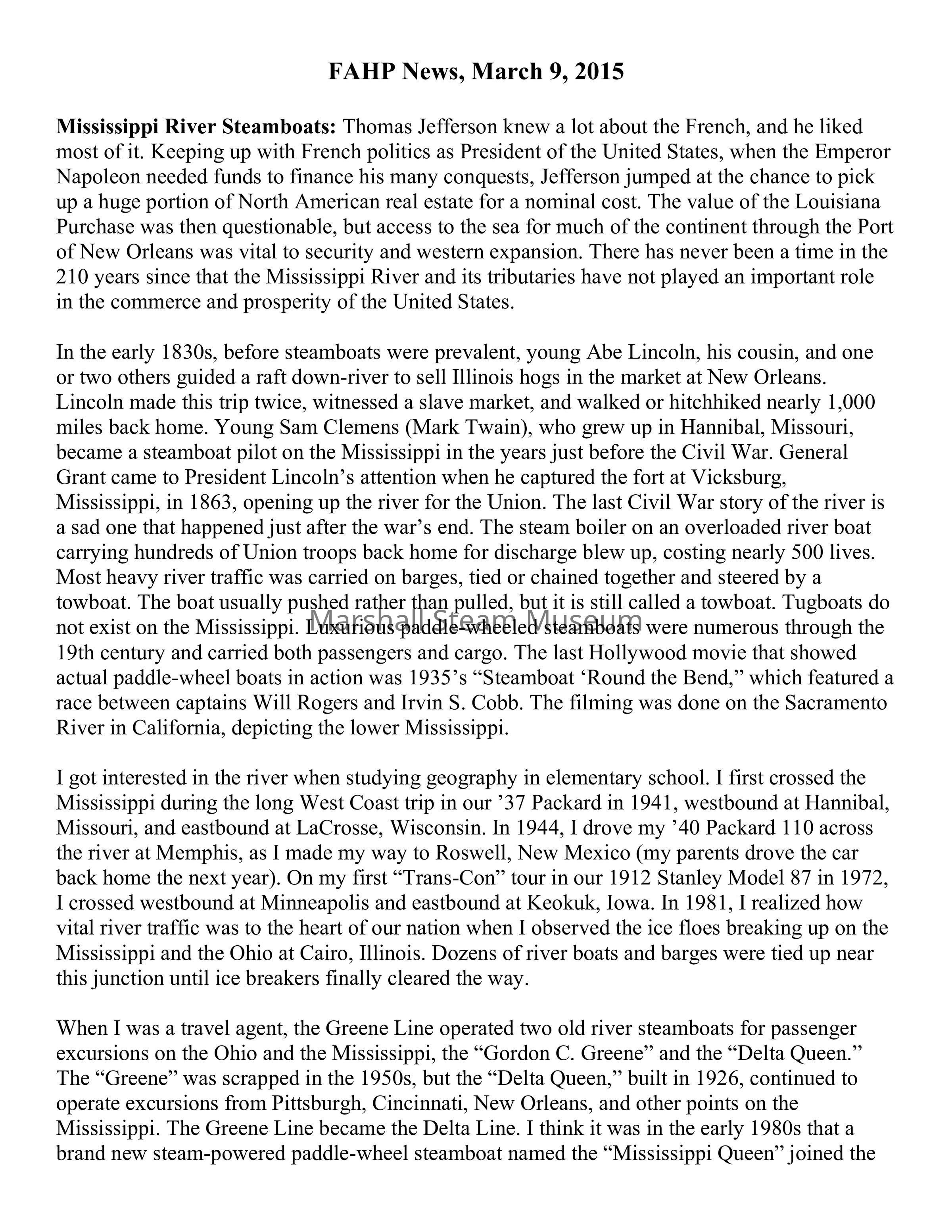Mississippi River Steamboats: Thomas Jefferson knew a lot about the French, and he liked most of it. Keeping up with French politics as President of the United States, when the Emperor Napoleon needed funds to finance his many conquests, Jefferson jumped at the chance to pick up a huge portion of North American real estate for a nominal cost. The value of the Louisiana Purchase was then questionable, but access to the sea for much of the continent through the Port of New Orleans was vital to security and western expansion. There has never been a time in the 210 years since that the Mississippi River and its tributaries have not played an important role in the commerce and prosperity of the United States.