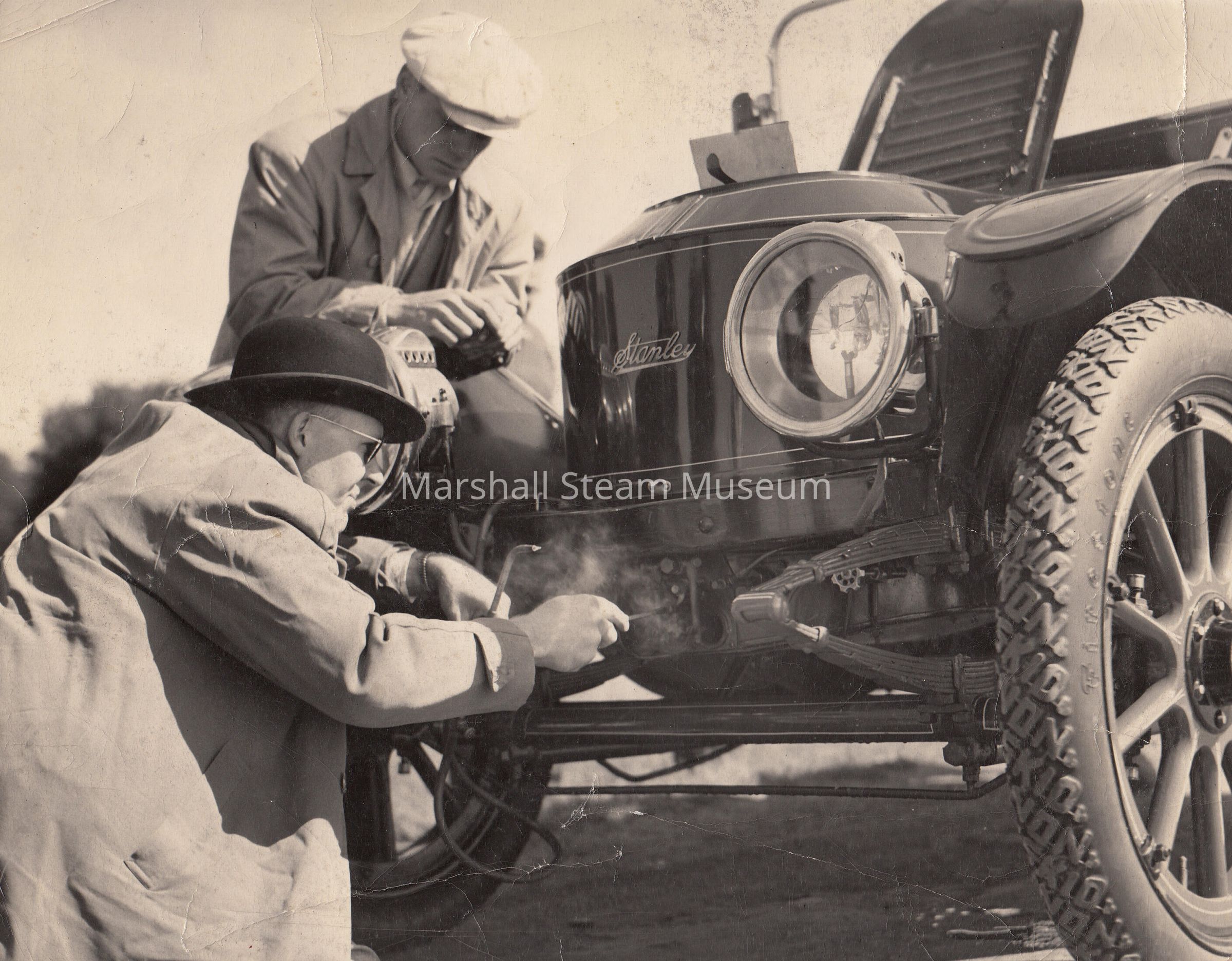 1950 Glidden Tour - Thomas C Marshall Jr repairing the 1913 Stanley Model 78, 1950Entry/Object ID