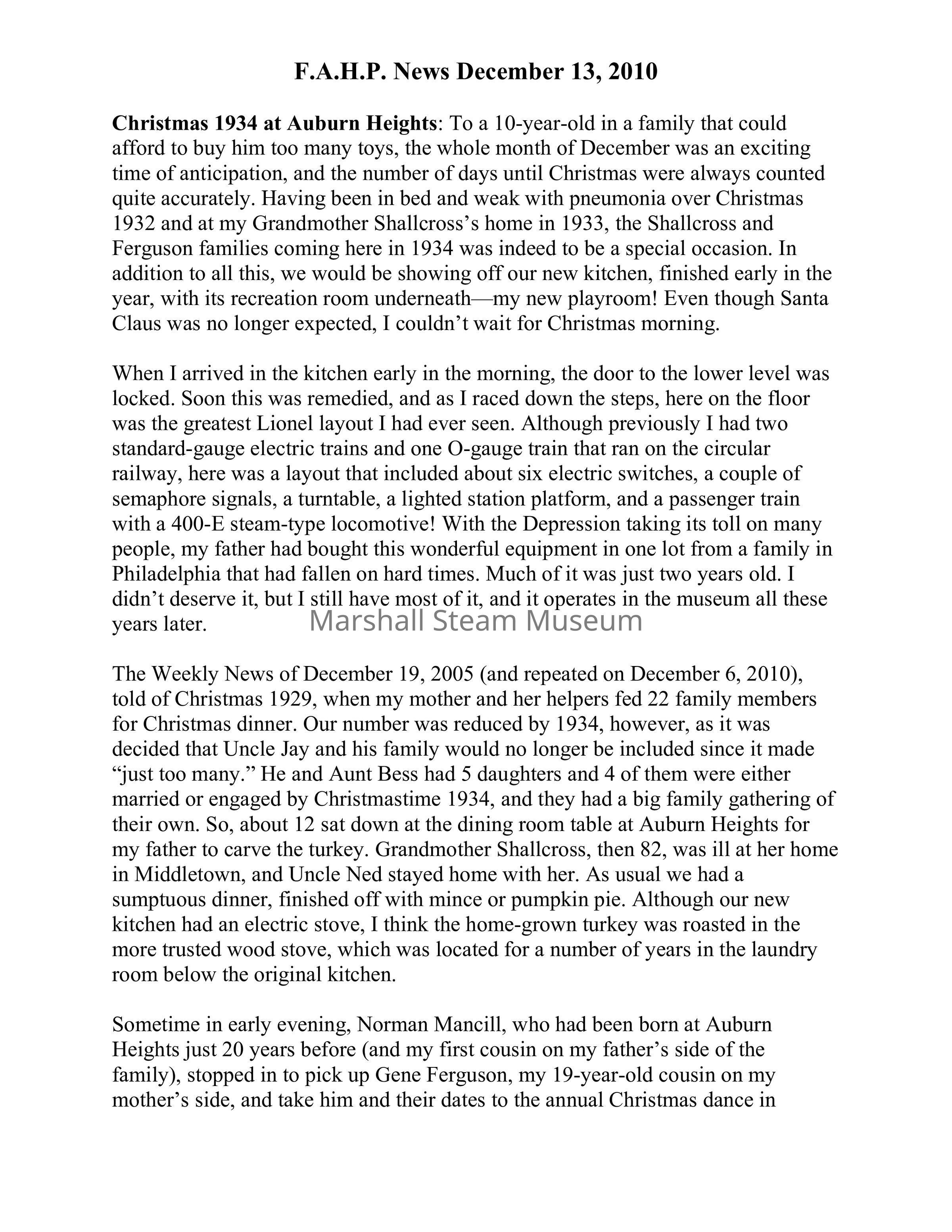 Christmas 1934 at Auburn Heights: To a 10-year-old in a family that could afford to buy him too many toys, the whole month of December was an exciting time of anticipation, and the number of days until Christmas were always counted quite accurately. Having been in bed and weak with pneumonia over Christmas 1932 and at my Grandmother Shallcross’s home in 1933, the Shallcross and Ferguson families coming here in 1934 was indeed to be a special occasion. In addition to all this, we would be showing off our new kitchen, finished early in the year, with its recreation room underneath—my new playroom! Even though Santa Claus was no longer expected, I couldn’t wait for Christmas morning.