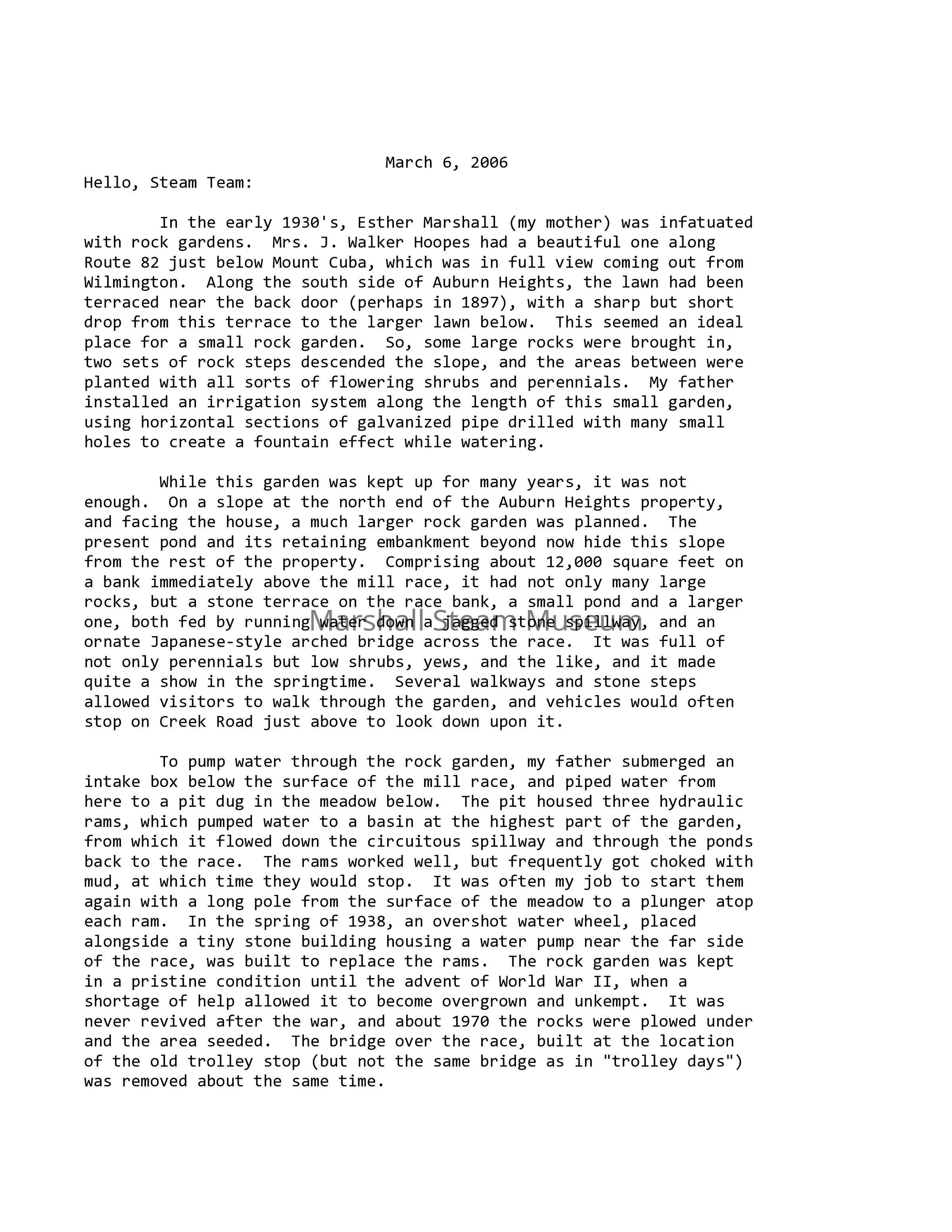 To pump water through the rock garden, my father submerged an intake box below the surface of the mill race, and piped water from here to a pit dug in the meadow below. The pit housed three hydraulic rams, which pumped water to a basin at the highest part of the garden, from which it flowed down the circuitous spillway and through the ponds back to the race. The rams worked well, but frequently got choked with mud, at which time they would stop. It was often my job to start them again with a long pole from the surface of the meadow to a plunger atop each ram. In the spring of 1938, an overshot water wheel, placed alongside a tiny stone building housing a water pump near the far side of the race, was built to replace the rams. The rock garden was kept in a pristine condition until the advent of World War II, when a shortage of help allowed it to become overgrown and unkempt. It was never revived after the war, and about 1970 the rocks were plowed under and the area seeded. The bridge over the race, built at the location of the old trolley stop (but not the same bridge as in "trolley days") was removed about the same time.