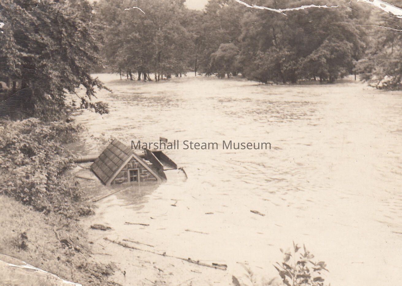 Flooded area showing just roof of building, trees in backgroundPhotograph Details