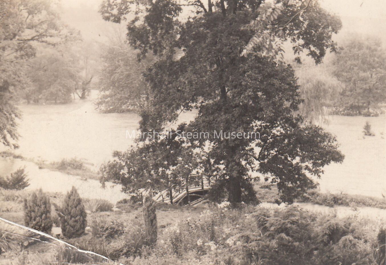 Photo of flood with footbridge over race and tree in foreground; below Auburn Heights rock gardenPhotograph Details
