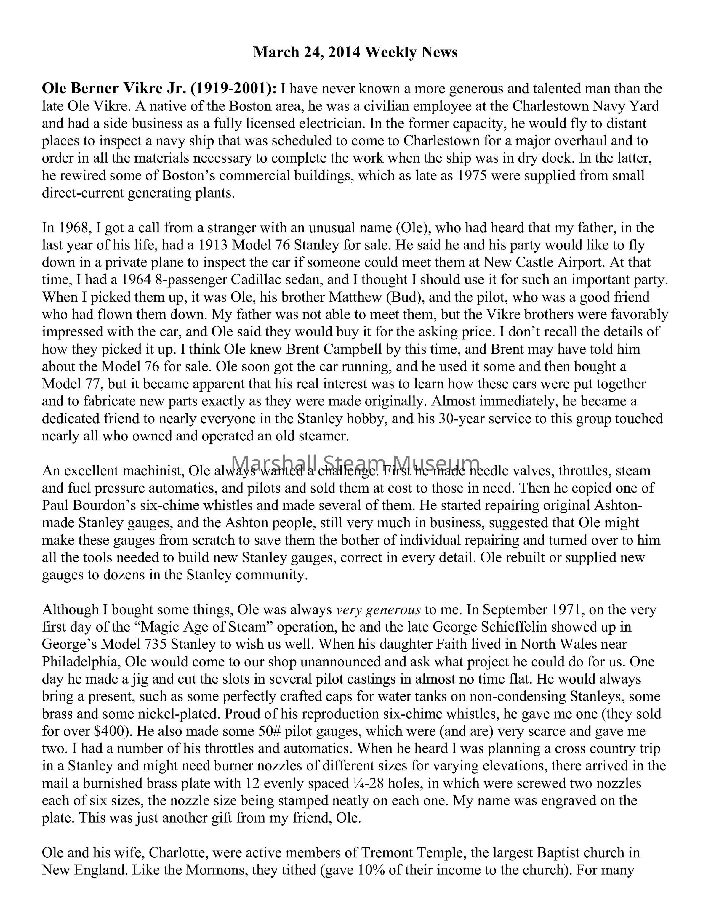 In 1968, I got a call from a stranger with an unusual name (Ole), who had heard that my father, in the last year of his life, had a 1913 Model 76 Stanley for sale. He said he and his party would like to fly down in a private plane to inspect the car if someone could meet them at New Castle Airport. At that time, I had a 1964 8-passenger Cadillac sedan, and I thought I should use it for such an important party. When I picked them up, it was Ole, his brother Matthew (Bud), and the pilot, who was a good friend who had flown them down. My father was not able to meet them, but the Vikre brothers were favorably impressed with the car, and Ole said they would buy it for the asking price. I don’t recall the details of how they picked it up. I think Ole knew Brent Campbell by this time, and Brent may have told him about the Model 76 for sale. Ole soon got the car running, and he used it some and then bought a Model 77, but it became apparent that his real interest was to learn how these cars were put together and to fabricate new parts exactly as they were made originally. Almost immediately, he became a dedicated friend to nearly everyone in the Stanley hobby, and his 30-year service to this group touched nearly all who owned and operated an old steamer.