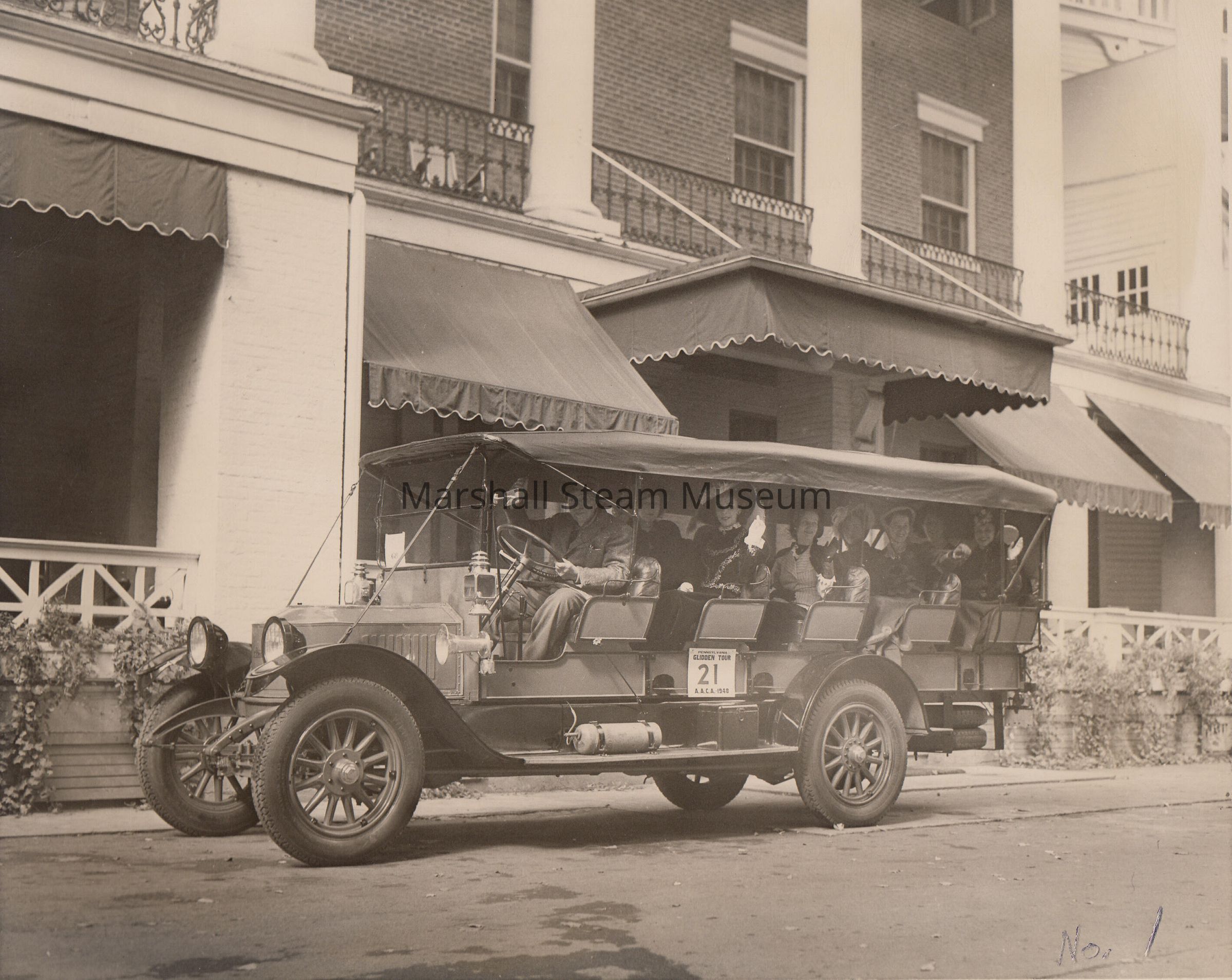 Front Writing/ Back Writing: "This is believed to be Bland Hoke, owner of Bedford Springs, and his costumed employees in T. Clarence Marshall's 1915 Stanley Mountain Wagon on the 1948 Glidden Tour."