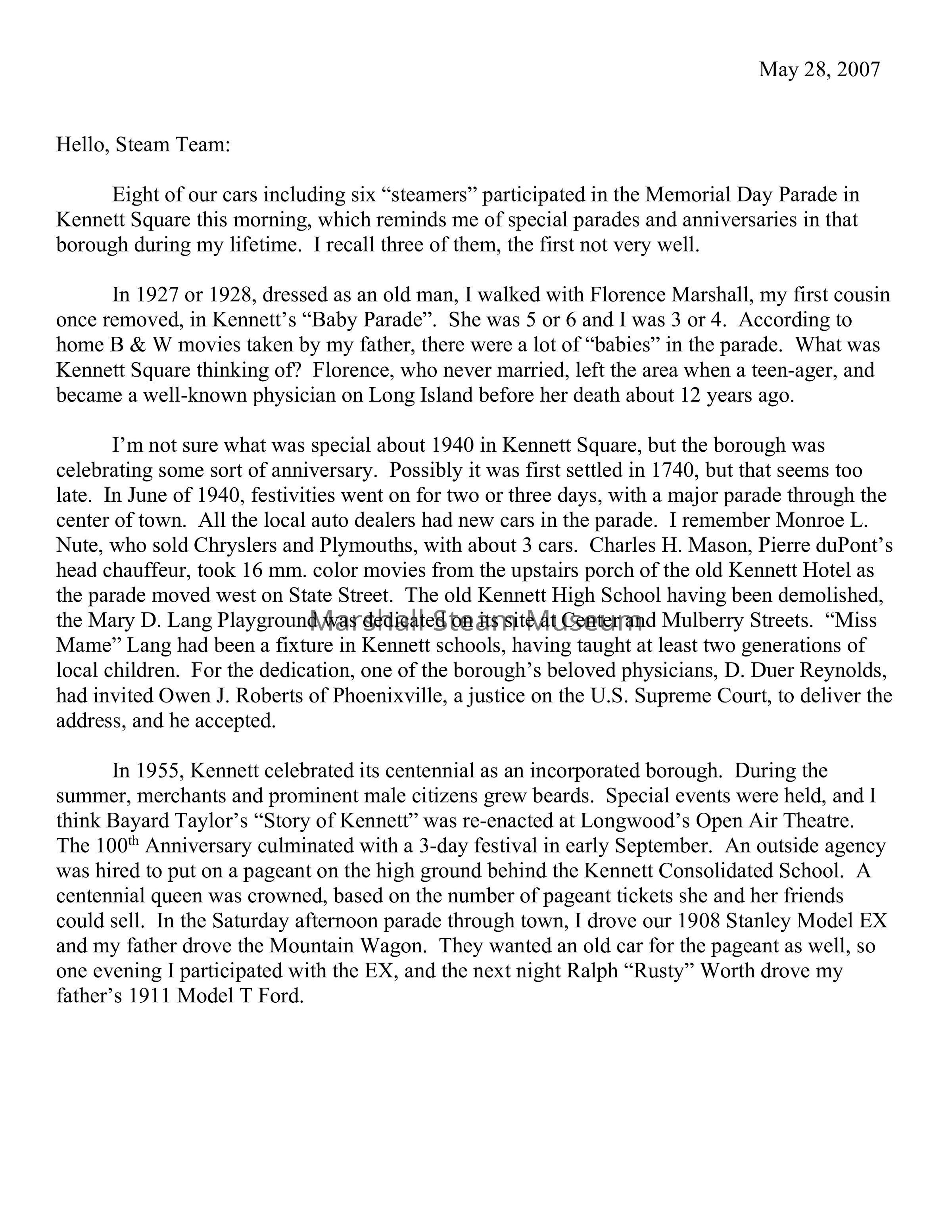In 1927 or 1928, dressed as an old man, I walked with Florence Marshall, my first cousin once removed, in Kennett’s “Baby Parade”. She was 5 or 6 and I was 3 or 4. According to home B & W movies taken by my father, there were a lot of “babies” in the parade. What was Kennett Square thinking of? Florence, who never married, left the area when a teen-ager, and became a well-known physician on Long Island before her death about 12 years ago.