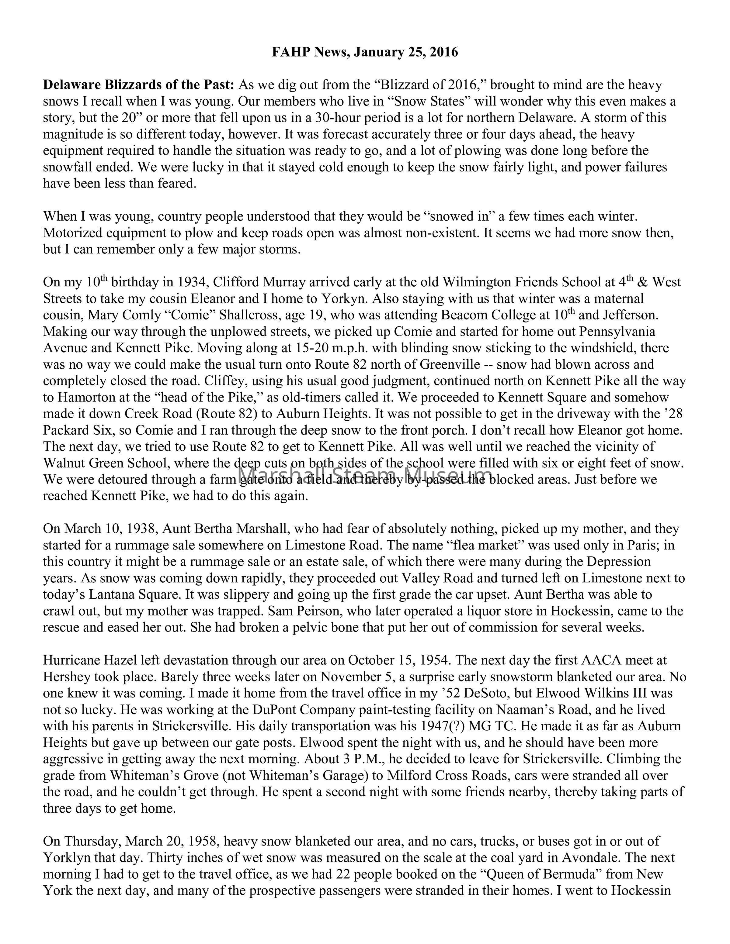 Delaware Blizzards of the Past: As we dig out from the “Blizzard of 2016,” brought to mind are the heavy snows I recall when I was young. Our members who live in “Snow States” will wonder why this even makes a story, but the 20” or more that fell upon us in a 30-hour period is a lot for northern Delaware. A storm of this magnitude is so different today, however. It was forecast accurately three or four days ahead, the heavy equipment required to handle the situation was ready to go, and a lot of plowing was done long before the snowfall ended. We were lucky in that it stayed cold enough to keep the snow fairly light, and power failures have been less than feared.