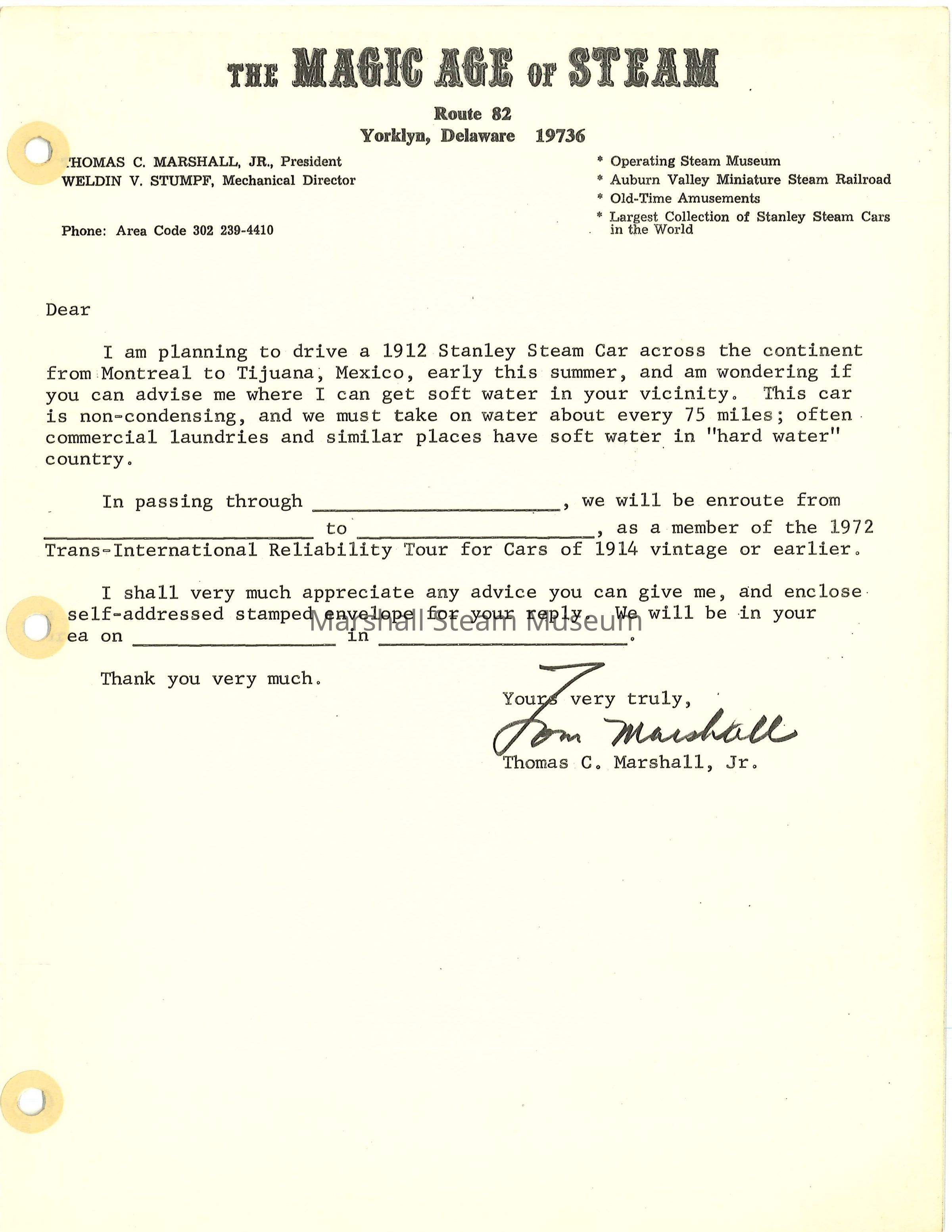 Form letters that Tom Marshall sent to find sources of soft water along the tour route. These were sent mostly to post masters.