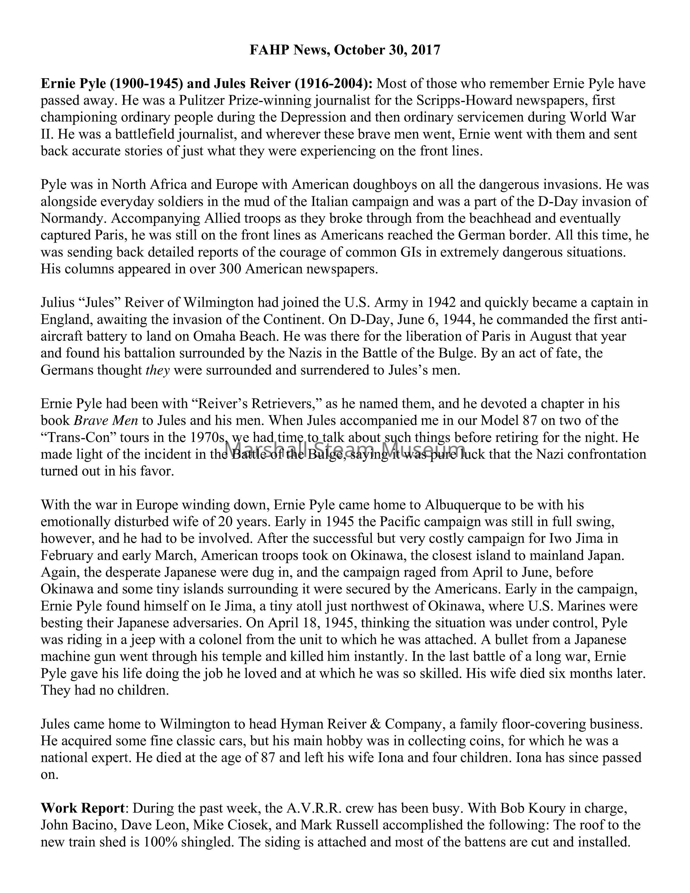 Work Report: During the past week, the A.V.R.R. crew has been busy. With Bob Koury in charge, John Bacino, Dave Leon, Mike Ciosek, and Mark Russell accomplished the following: The roof to the new train shed is 100% shingled. The siding is attached and most of the battens are cut and installed. Parts had to be taken from the siding switch to make a temporary repair to the mainline switch at the tunnel. On the building, 90% of the siding has been painted, and 95% of the trim has been cut and installed. One door is almost finished, and the hardware is on hand to finish the job.