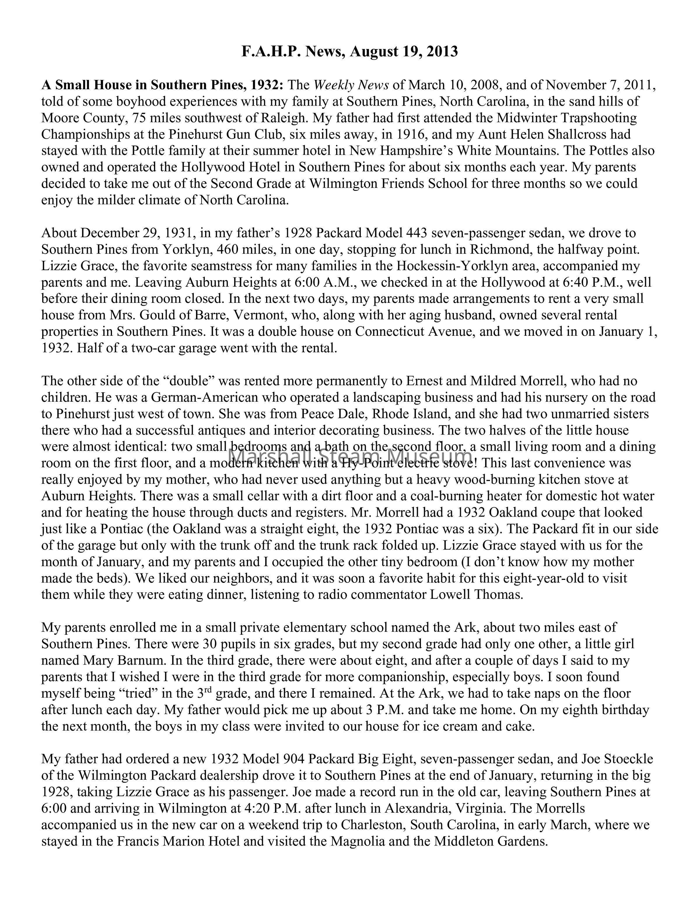 About December 29, 1931, in my father’s 1928 Packard Model 443 seven-passenger sedan, we drove to Southern Pines from Yorklyn, 460 miles, in one day, stopping for lunch in Richmond, the halfway point. Lizzie Grace, the favorite seamstress for many families in the Hockessin-Yorklyn area, accompanied my parents and me. Leaving Auburn Heights at 6:00 A.M., we checked in at the Hollywood at 6:40 P.M., well before their dining room closed. In the next two days, my parents made arrangements to rent a very small house from Mrs. Gould of Barre, Vermont, who, along with her aging husband, owned several rental properties in Southern Pines. It was a double house on Connecticut Avenue, and we moved in on January 1, 1932. Half of a two-car garage went with the rental.