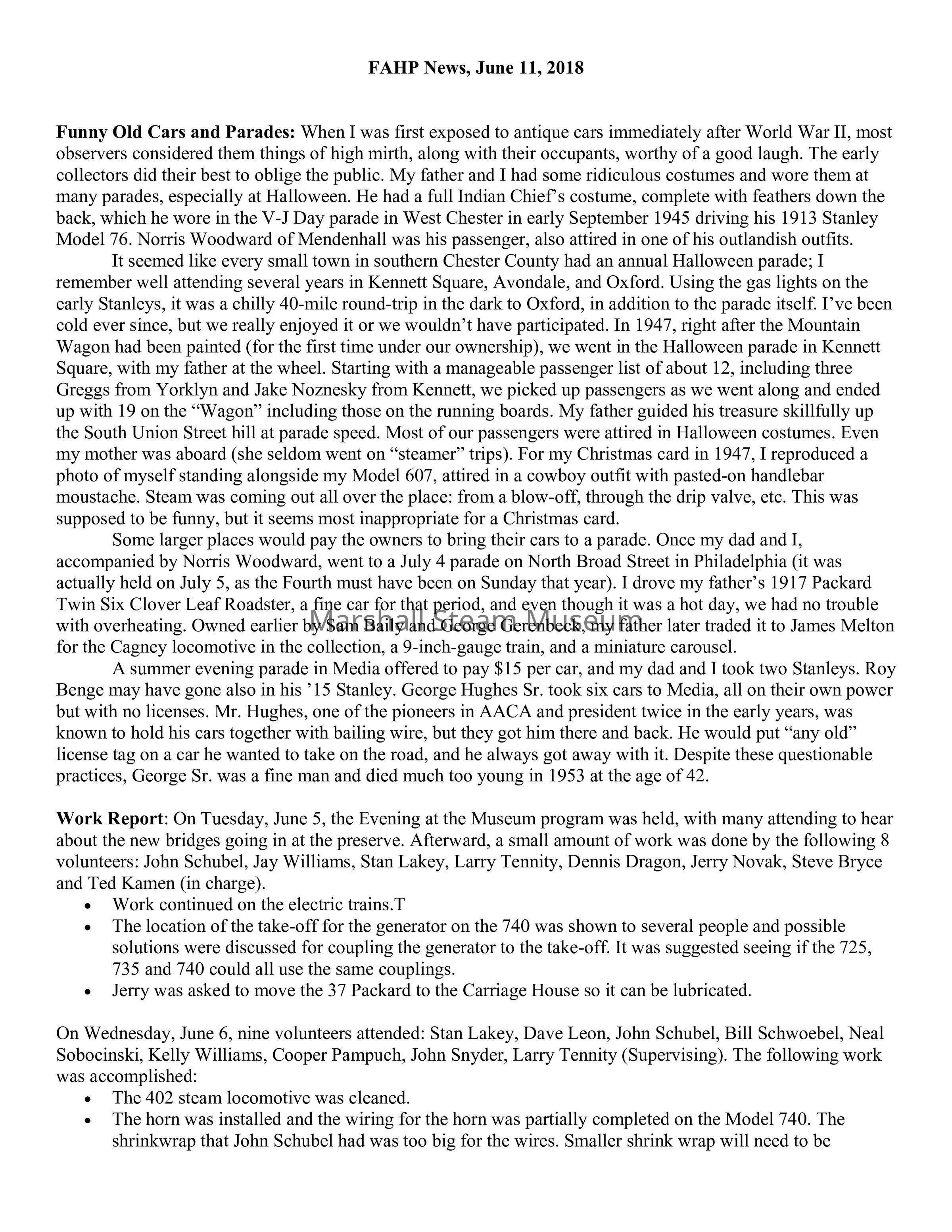 Funny Old Cars and Parades: When I was first exposed to antique cars immediately after World War II, most observers considered them things of high mirth, along with their occupants, worthy of a good laugh. The early collectors did their best to oblige the public. My father and I had some ridiculous costumes and wore them at many parades, especially at Halloween. He had a full Indian Chief’s costume, complete with feathers down the back, which he wore in the V-J Day parade in West Chester in early September 1945 driving his 1913 Stanley Model 76. Norris Woodward of Mendenhall was his passenger, also attired in one of his outlandish outfits.