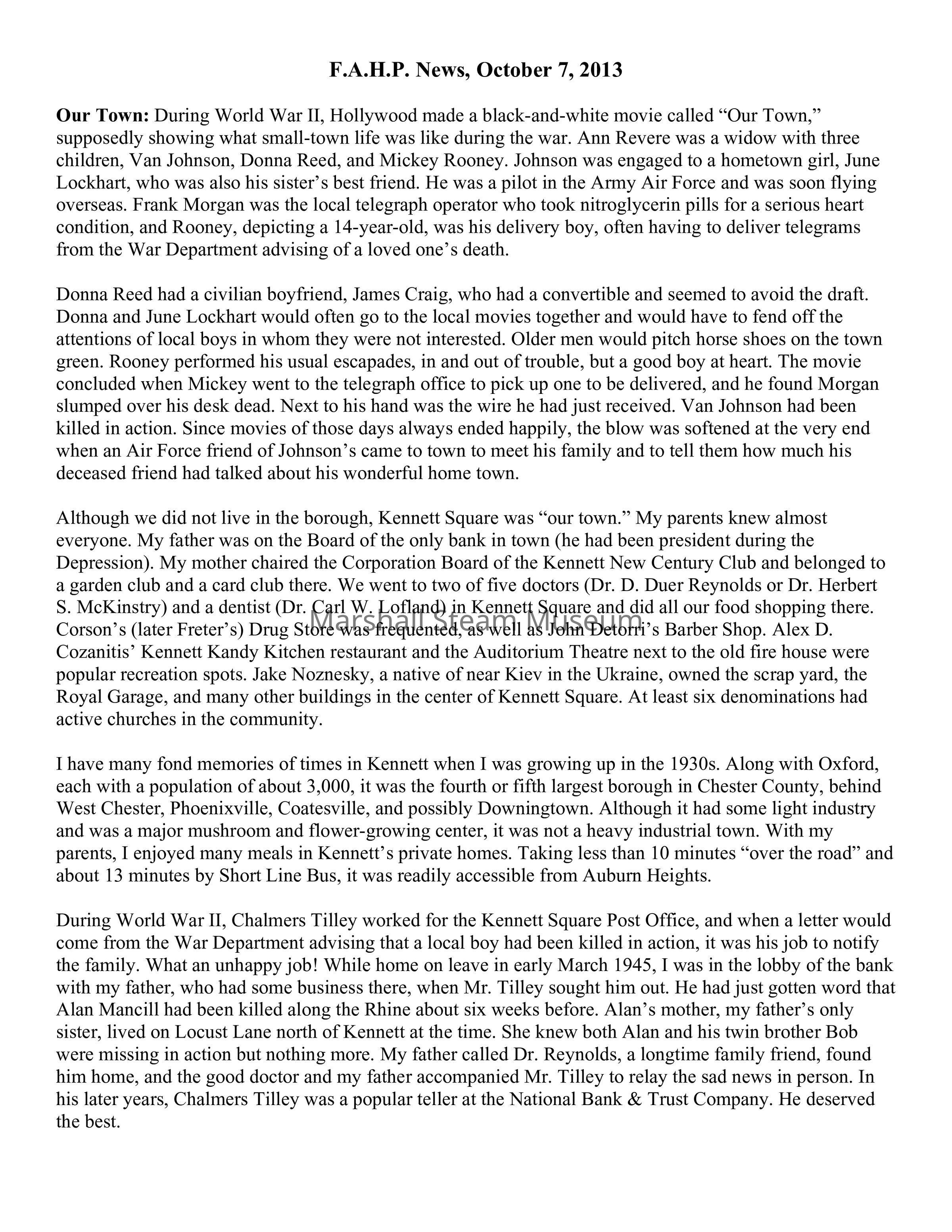 During World War II, Chalmers Tilley worked for the Kennett Square Post Office, and when a letter would come from the War Department advising that a local boy had been killed in action, it was his job to notify the family. What an unhappy job! While home on leave in early March 1945, I was in the lobby of the bank with my father, who had some business there, when Mr. Tilley sought him out. He had just gotten word that Alan Mancill had been killed along the Rhine about six weeks before. Alan’s mother, my father’s only sister, lived on Locust Lane north of Kennett at the time. She knew both Alan and his twin brother Bob were missing in action but nothing more. My father called Dr. Reynolds, a longtime family friend, found him home, and the good doctor and my father accompanied Mr. Tilley to relay the sad news in person. In his later years, Chalmers Tilley was a popular teller at the National Bank & Trust Company. He deserved the best.