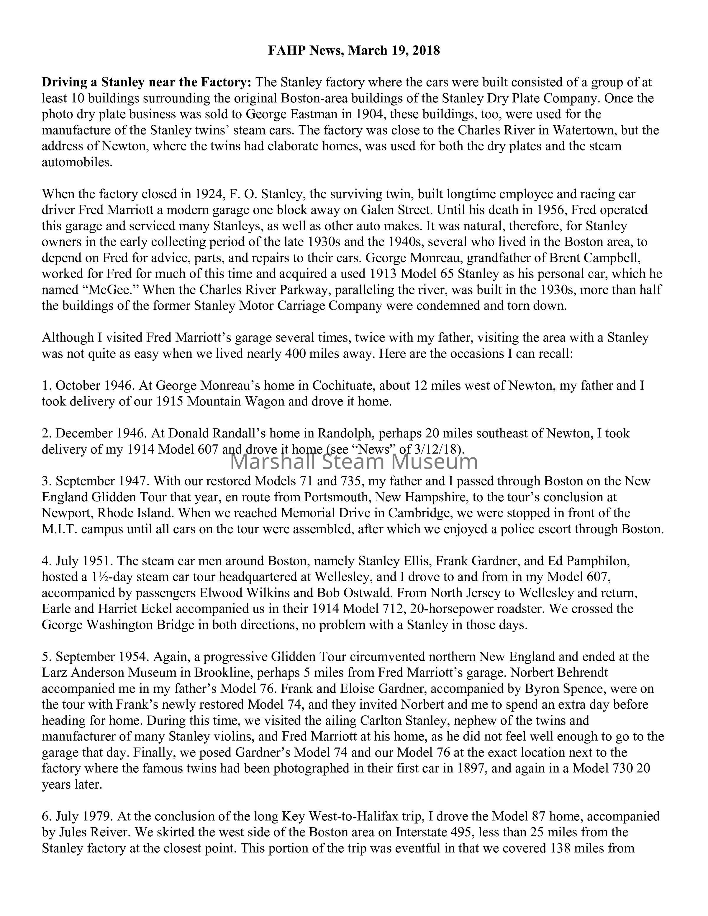 5. September 1954. Again, a progressive Glidden Tour circumvented northern New England and ended at the Larz Anderson Museum in Brookline, perhaps 5 miles from Fred Marriott’s garage. Norbert Behrendt accompanied me in my father’s Model 76. Frank and Eloise Gardner, accompanied by Byron Spence, were on the tour with Frank’s newly restored Model 74, and they invited Norbert and me to spend an extra day before heading for home. During this time, we visited the ailing Carlton Stanley, nephew of the twins and manufacturer of many Stanley violins, and Fred Marriott at his home, as he did not feel well enough to go to the garage that day. Finally, we posed Gardner’s Model 74 and our Model 76 at the exact location next to the factory where the famous twins had been photographed in their first car in 1897, and again in a Model 730 20 years later.