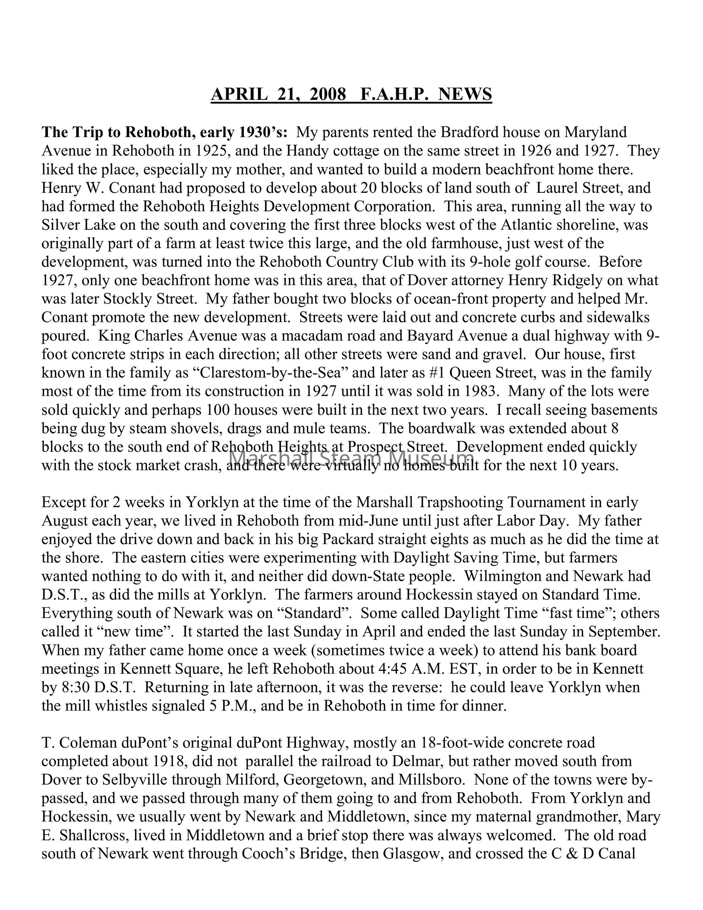 We joined the duPont Highway at the H & H Garage just north of Blackbird, then through the main street of Smyrna (is it Commerce Street?), and into Dover across Silver Lake and down State Street to the center of town. No turns were made as we proceeded straight south past some wonderful old-fashioned produce places under the trees, skirted Rising Sun and went through Magnolia. Traveling down the main street of Frederica, there was an old wooden bridge over the Murderkill, and soon we passed the large cemetery on our left entering Milford. South of the Mispillian and near the dead end of Milford’s main street, we turned left, passed Marshall’s Pond, and then the two-mile-long Diamond State Nursery, Lester C. Lovett, Proprietor. At Argo’s Corner, the roof of a garage was painted with the lettering: “This is Argo. Slaughter Beach, 3 miles”. Eventually we crossed the draw bridge over the Broadkill and passed through Nassau, Five Points, and Westcoat’s Corner, where an attractive sign with flower beds around it pointed to Rehoboth, right, and Lewes, left. Nearing Rehoboth, there was no choice but to swing left, cross the canal on another draw bridge and proceed straight down Rehoboth Avenue, unless, of course, you were headed for the “Pines”, in which case you veered left onto Columbia Avenue. We called it 100 miles from Yorklyn to Rehoboth, but it was about 96. Before the concrete road was built from Milford through Nassau (later to be Delaware Route 14) about 1927, it was necessary to go via Georgetown, and then the total mileage was well over 100. I loved the ride almost as much as my father did. By the time he occasionally drove to Rehoboth in the Model 740 Stanley during World War II, the duPont Highway was a dual road as far south as Dover, and there were by-passes around Smyrna, Dover, Frederica, and Milford, passing east of downtown in all cases, and the preferred route by-passed Magnolia in favor of a more easterly route with a new draw bridge over the St. Jones River. I guess Little Heaven was always there, but I never knew of that name until many years later.