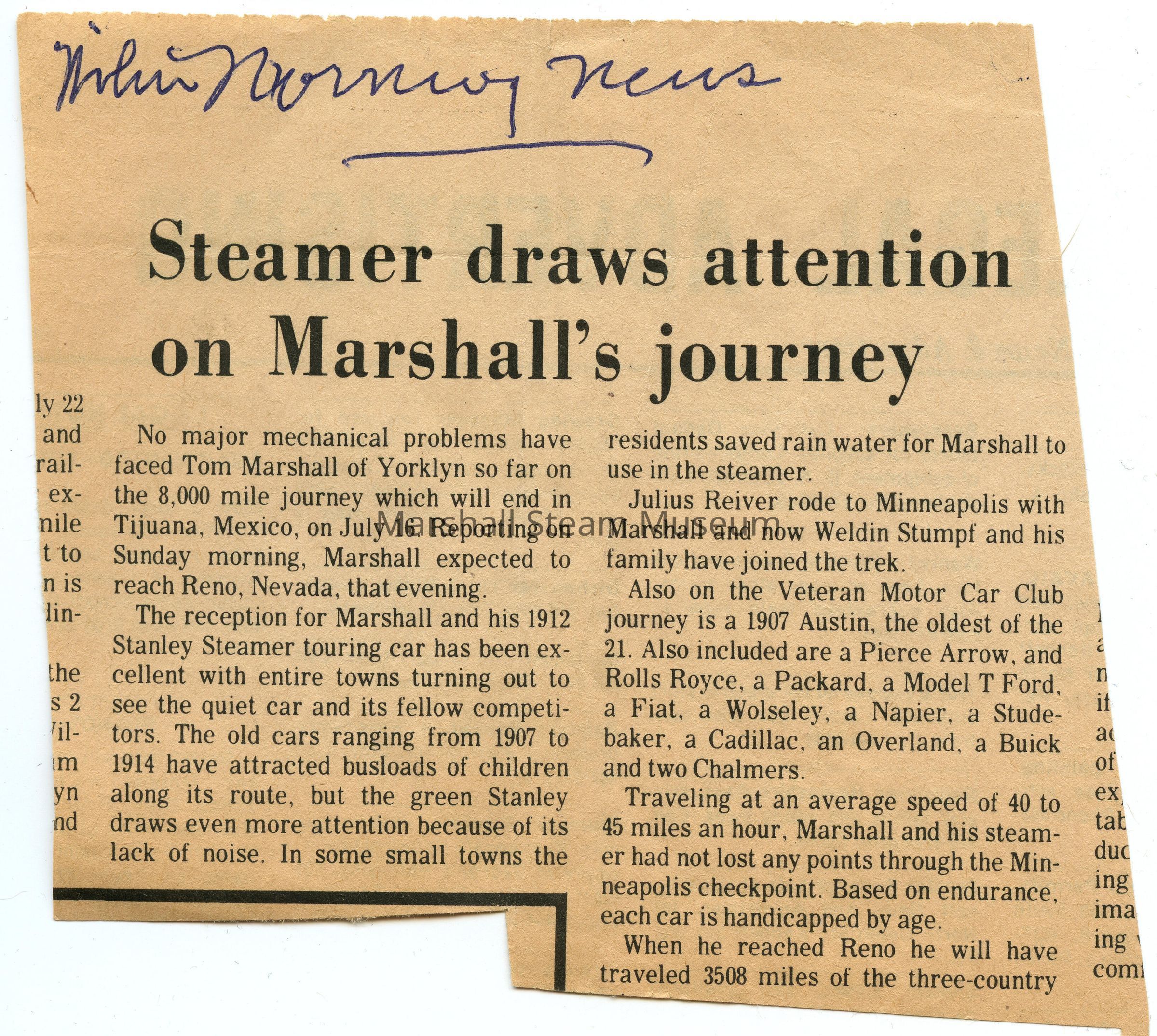 "Wilmington Morning News" clipping describes Tom Marshall's 1912 Stanley Steamer car tour on the 8,000 mile journey. Text describes the popularity of the tour as he makes his way to Reno, Nevada by July 16th.
