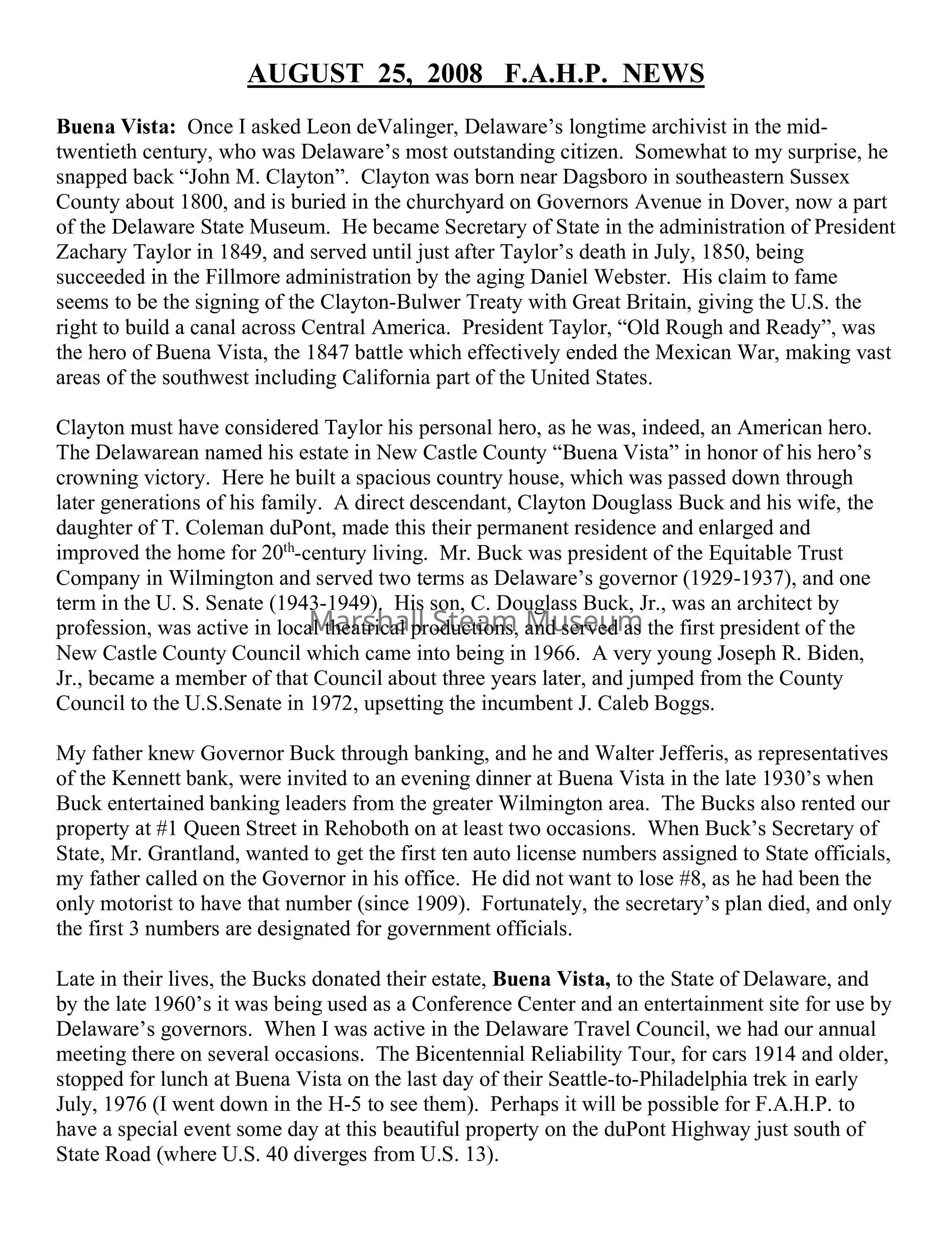 Clayton must have considered Taylor his personal hero, as he was, indeed, an American hero. The Delawarean named his estate in New Castle County “Buena Vista” in honor of his hero’s crowning victory. Here he built a spacious country house, which was passed down through later generations of his family. A direct descendant, Clayton Douglass Buck and his wife, the daughter of T. Coleman duPont, made this their permanent residence and enlarged and improved the home for 20th-century living. Mr. Buck was president of the Equitable Trust Company in Wilmington and served two terms as Delaware’s governor (1929-1937), and one term in the U. S. Senate (1943-1949). His son, C. Douglass Buck, Jr., was an architect by profession, was active in local theatrical productions, and served as the first president of the New Castle County Council which came into being in 1966. A very young Joseph R. Biden, Jr., became a member of that Council about three years later, and jumped from the County Council to the U.S.Senate in 1972, upsetting the incumbent J. Caleb Boggs.