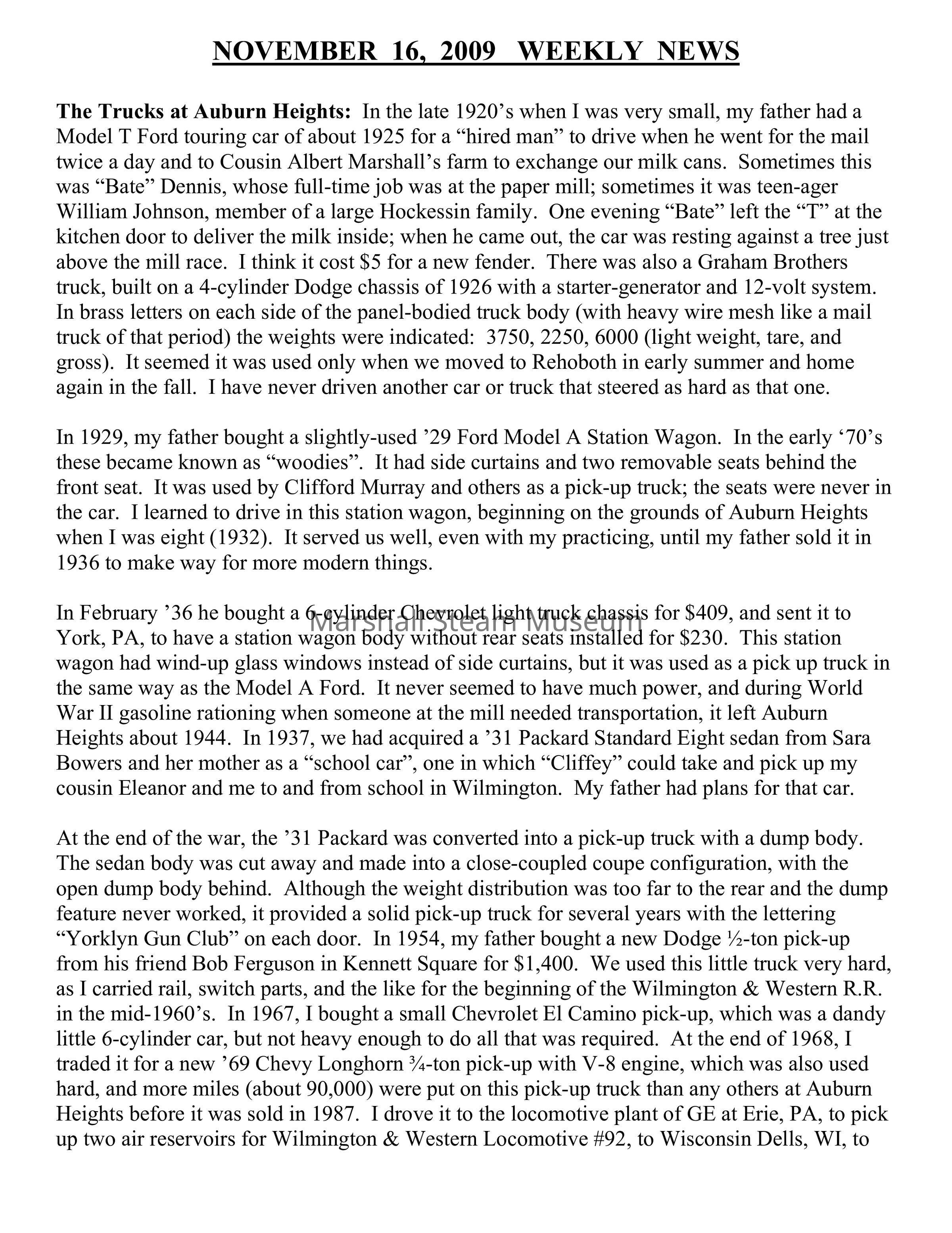 The Trucks at Auburn Heights: In the late 1920’s when I was very small, my father had a Model T Ford touring car of about 1925 for a “hired man” to drive when he went for the mail twice a day and to Cousin Albert Marshall’s farm to exchange our milk cans. Sometimes this was “Bate” Dennis, whose full-time job was at the paper mill; sometimes it was teen-ager William Johnson, member of a large Hockessin family. One evening “Bate” left the “T” at the kitchen door to deliver the milk inside; when he came out, the car was resting against a tree just above the mill race. I think it cost $5 for a new fender. There was also a Graham Brothers truck, built on a 4-cylinder Dodge chassis of 1926 with a starter-generator and 12-volt system. In brass letters on each side of the panel-bodied truck body (with heavy wire mesh like a mail truck of that period) the weights were indicated: 3750, 2250, 6000 (light weight, tare, and gross). It seemed it was used only when we moved to Rehoboth in early summer and home again in the fall. I have never driven another car or truck that steered as hard as that one.