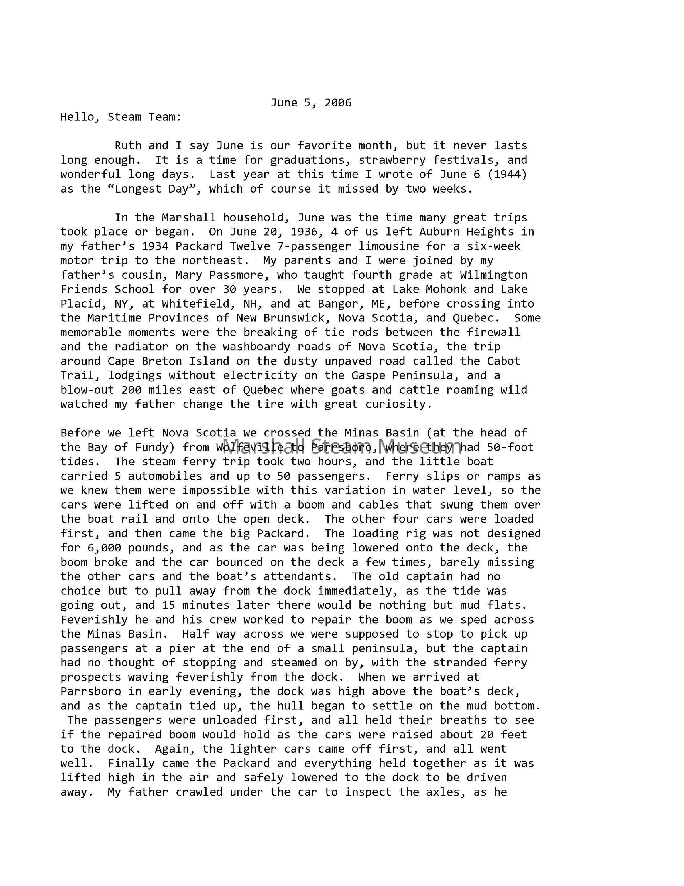 Before we left Nova Scotia we crossed the Minas Basin (at the head of the Bay of Fundy) from Wolfeville to Parrsboro, where they had 50-foot tides. The steam ferry trip took two hours, and the little boat carried 5 automobiles and up to 50 passengers. Ferry slips or ramps as we knew them were impossible with this variation in water level, so the cars were lifted on and off with a boom and cables that swung them over the boat rail and onto the open deck. The other four cars were loaded first, and then came the big Packard. The loading rig was not designed for 6,000 pounds, and as the car was being lowered onto the deck, the boom broke and the car bounced on the deck a few times, barely missing the other cars and the boat’s attendants. The old captain had no choice but to pull away from the dock immediately, as the tide was going out, and 15 minutes later there would be nothing but mud flats. Feverishly he and his crew worked to repair the boom as we sped across the Minas Basin. Half way across we were supposed to stop to pick up passengers at a pier at the end of a small peninsula, but the captain had no thought of stopping and steamed on by, with the stranded ferry prospects waving feverishly from the dock. When we arrived at Parrsboro in early evening, the dock was high above the boat’s deck, and as the captain tied up, the hull began to settle on the mud bottom. The passengers were unloaded first, and all held their breaths to see if the repaired boom would hold as the cars were raised about 20 feet to the dock. Again, the lighter cars came off first, and all went well. Finally came the Packard and everything held together as it was lifted high in the air and safely lowered to the dock to be driven away. My father crawled under the car to inspect the axles, as he feared they might be bent. Finding everything in apparent good shape, we drove away toward Monkton and the rest of our trip, with no stories to tell from the 6-week adventure to equal that one.
