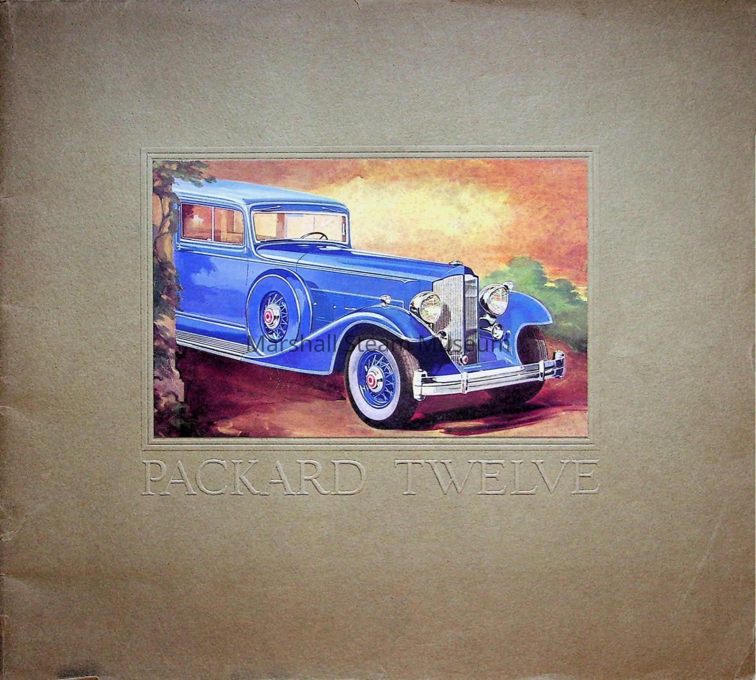 Brochure for the 1933 Packard Twelve containing images, photos, line drawings and specifcations.