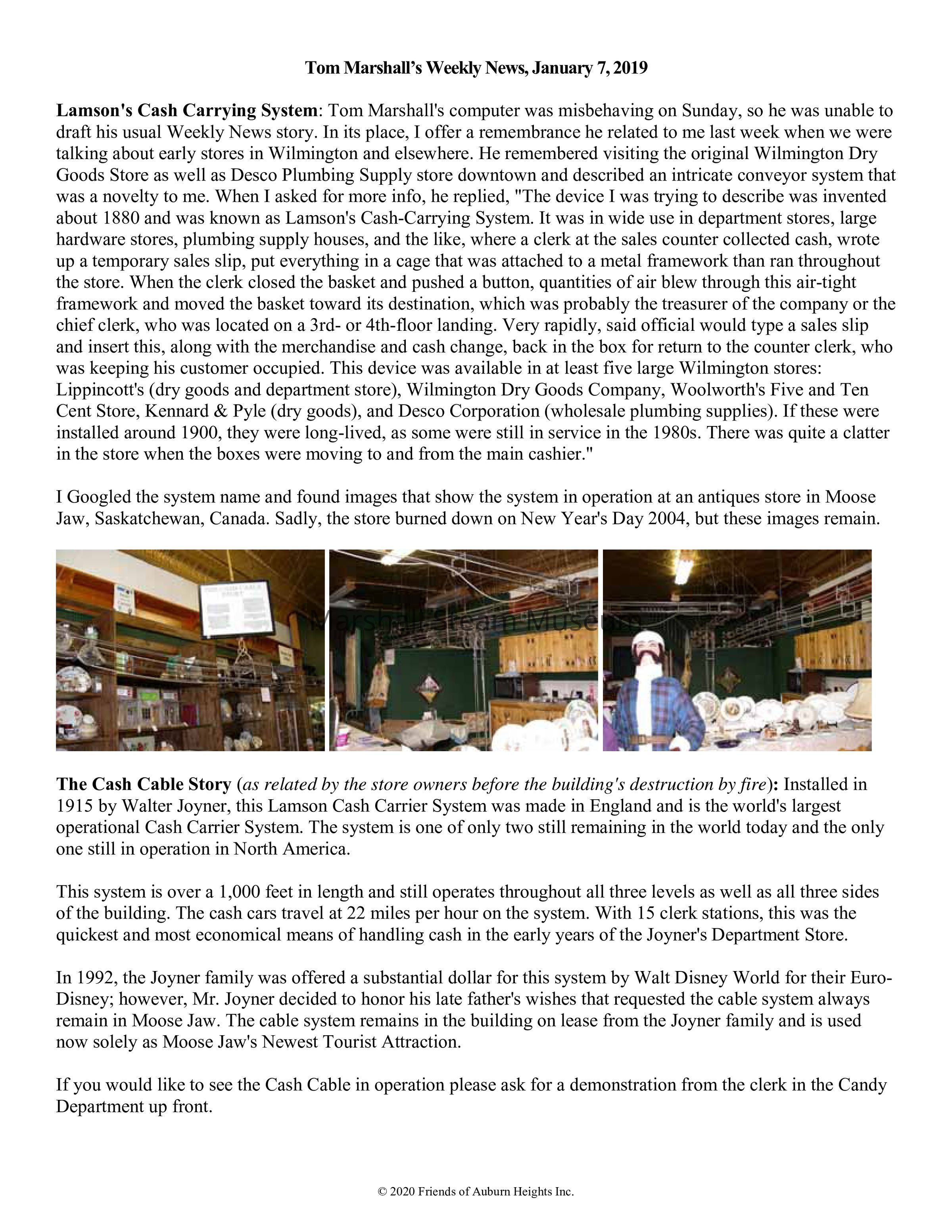 Lamson's Cash Carrying System: Tom Marshall's computer was misbehaving on Sunday, so he was unable to draft his usual Weekly News story. In its place, I offer a remembrance he related to me last week when we were talking about early stores in Wilmington and elsewhere. He remembered visiting the original Wilmington Dry Goods Store as well as Desco Plumbing Supply store downtown and described an intricate conveyor system that was a novelty to me. When I asked for more info, he replied, "The device I was trying to describe was invented about 1880 and was known as Lamson's Cash-Carrying System. It was in wide use in department stores, large hardware stores, plumbing supply houses, and the like, where a clerk at the sales counter collected cash, wrote up a temporary sales slip, put everything in a cage that was attached to a metal framework than ran throughout the store. When the clerk closed the basket and pushed a button, quantities of air blew through this air-tight framework and moved the basket toward its destination, which was probably the treasurer of the company or the chief clerk, who was located on a 3rd- or 4th-floor landing. Very rapidly, said official would type a sales slip and insert this, along with the merchandise and cash change, back in the box for return to the counter clerk, who was keeping his customer occupied. This device was available in at least five large Wilmington stores: Lippincott's (dry goods and department store), Wilmington Dry Goods Company, Woolworth's Five and Ten Cent Store, Kennard & Pyle (dry goods), and Desco Corporation (wholesale plumbing supplies). If these were installed around 1900, they were long-lived, as some were still in service in the 1980s. There was quite a clatter in the store when the boxes were moving to and from the main cashier."