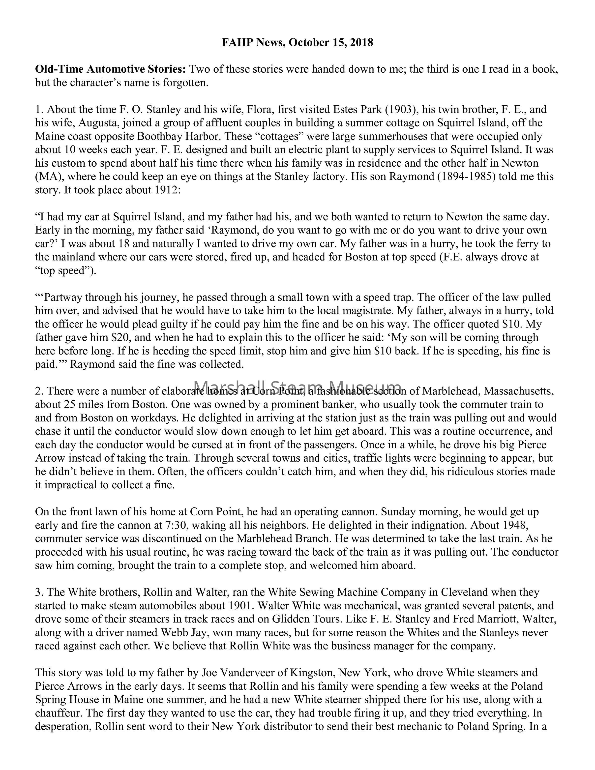 1. About the time F. O. Stanley and his wife, Flora, first visited Estes Park (1903), his twin brother, F. E., and his wife, Augusta, joined a group of affluent couples in building a summer cottage on Squirrel Island, off the Maine coast opposite Boothbay Harbor. These “cottages” were large summerhouses that were occupied only about 10 weeks each year. F. E. designed and built an electric plant to supply services to Squirrel Island. It was his custom to spend about half his time there when his family was in residence and the other half in Newton (MA), where he could keep an eye on things at the Stanley factory. His son Raymond (1894-1985) told me this story. It took place about 1912: