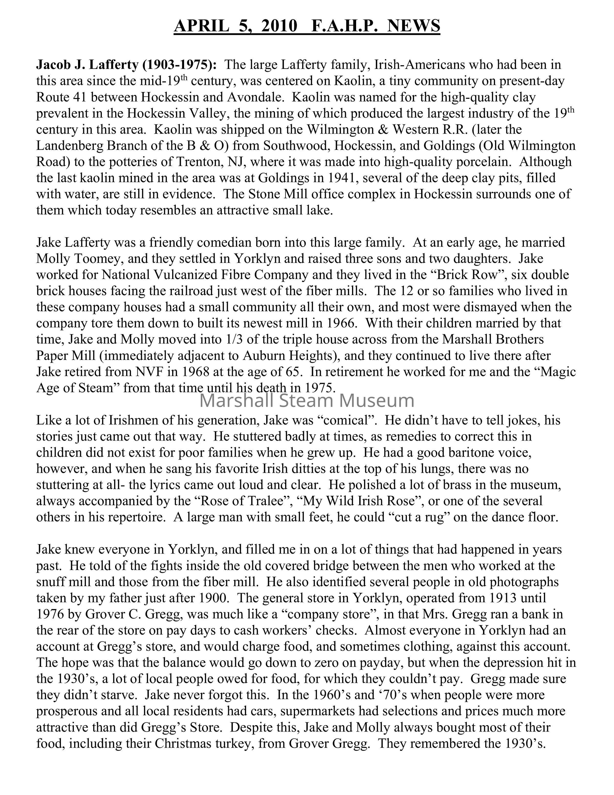 Jake Lafferty was a friendly comedian born into this large family. At an early age, he married Molly Toomey, and they settled in Yorklyn and raised three sons and two daughters. Jake worked for National Vulcanized Fibre Company and they lived in the “Brick Row”, six double brick houses facing the railroad just west of the fiber mills. The 12 or so families who lived in these company houses had a small community all their own, and most were dismayed when the company tore them down to built its newest mill in 1966. With their children married by that time, Jake and Molly moved into 1/3 of the triple house across from the Marshall Brothers Paper Mill (immediately adjacent to Auburn Heights), and they continued to live there after Jake retired from NVF in 1968 at the age of 65. In retirement he worked for me and the “Magic Age of Steam” from that time until his death in 1975.