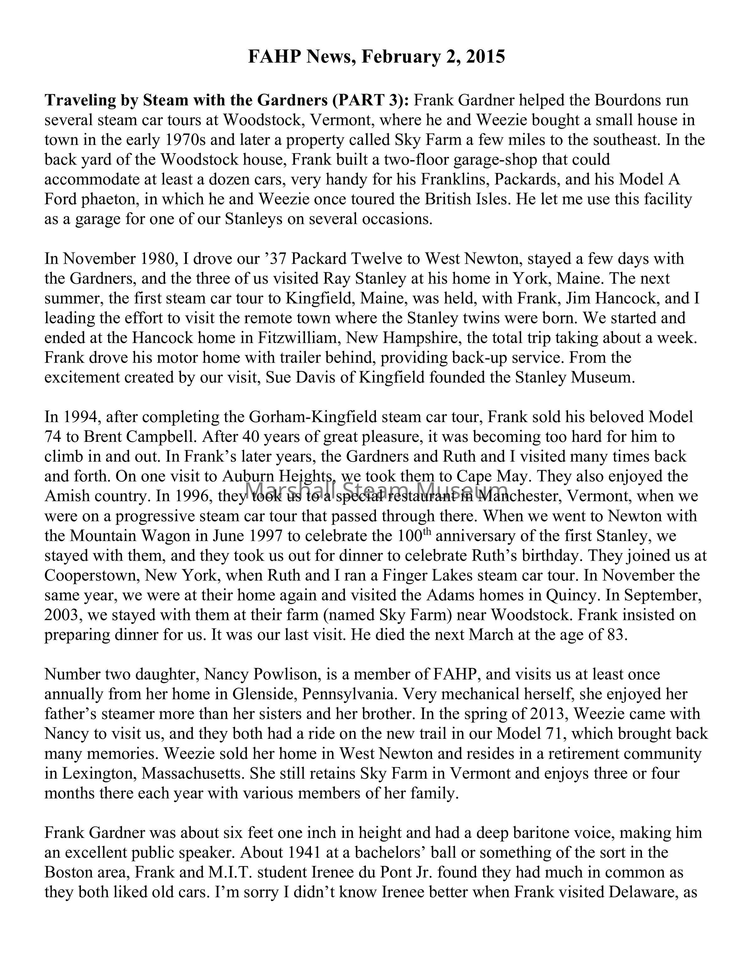 Traveling by Steam with the Gardners (PART 3): Frank Gardner helped the Bourdons run several steam car tours at Woodstock, Vermont, where he and Weezie bought a small house in town in the early 1970s and later a property called Sky Farm a few miles to the southeast. In the back yard of the Woodstock house, Frank built a two-floor garage-shop that could accommodate at least a dozen cars, very handy for his Franklins, Packards, and his Model A Ford phaeton, in which he and Weezie once toured the British Isles. He let me use this facility as a garage for one of our Stanleys on several occasions.