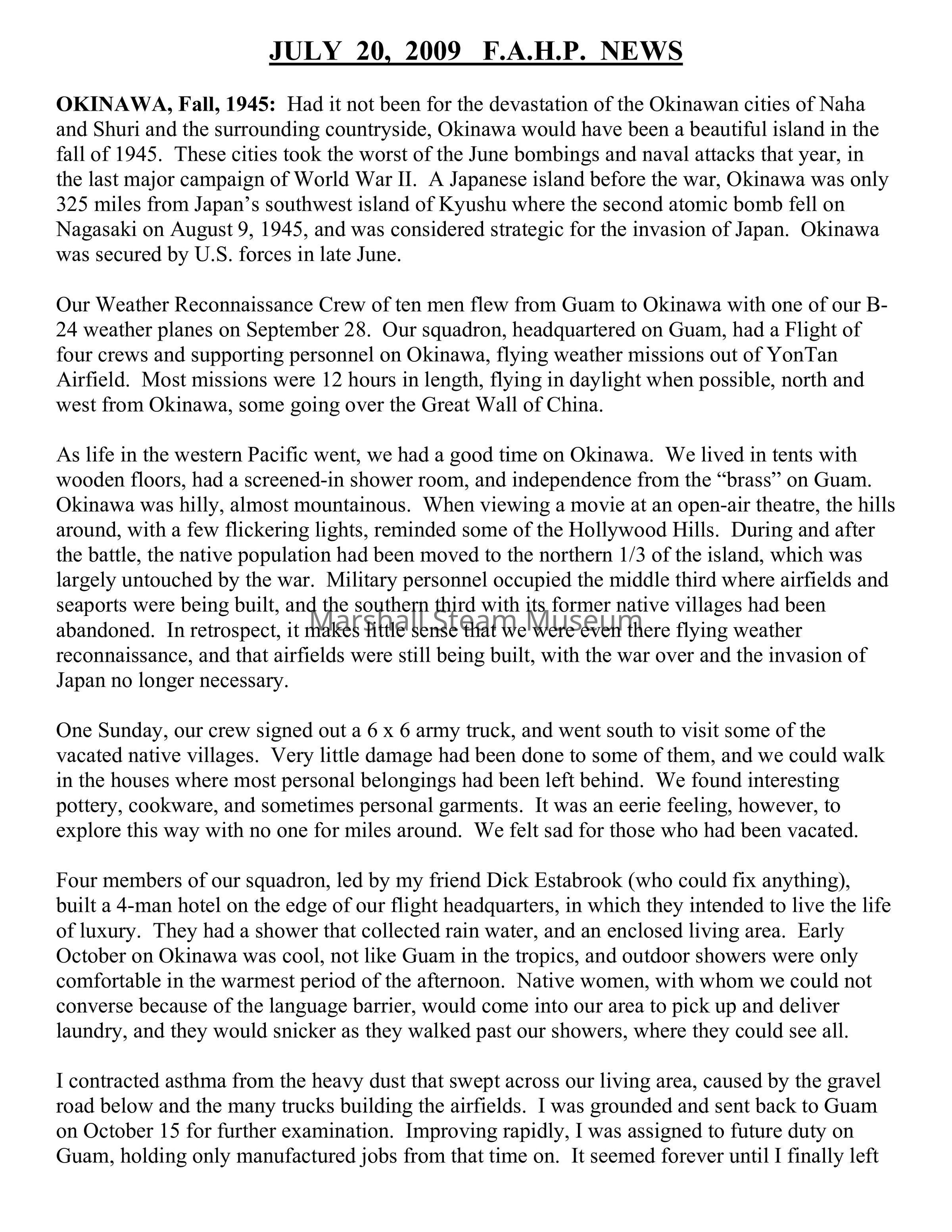 Our Weather Reconnaissance Crew of ten men flew from Guam to Okinawa with one of our B-24 weather planes on September 28. Our squadron, headquartered on Guam, had a Flight of four crews and supporting personnel on Okinawa, flying weather missions out of YonTan Airfield. Most missions were 12 hours in length, flying in daylight when possible, north and west from Okinawa, some going over the Great Wall of China.