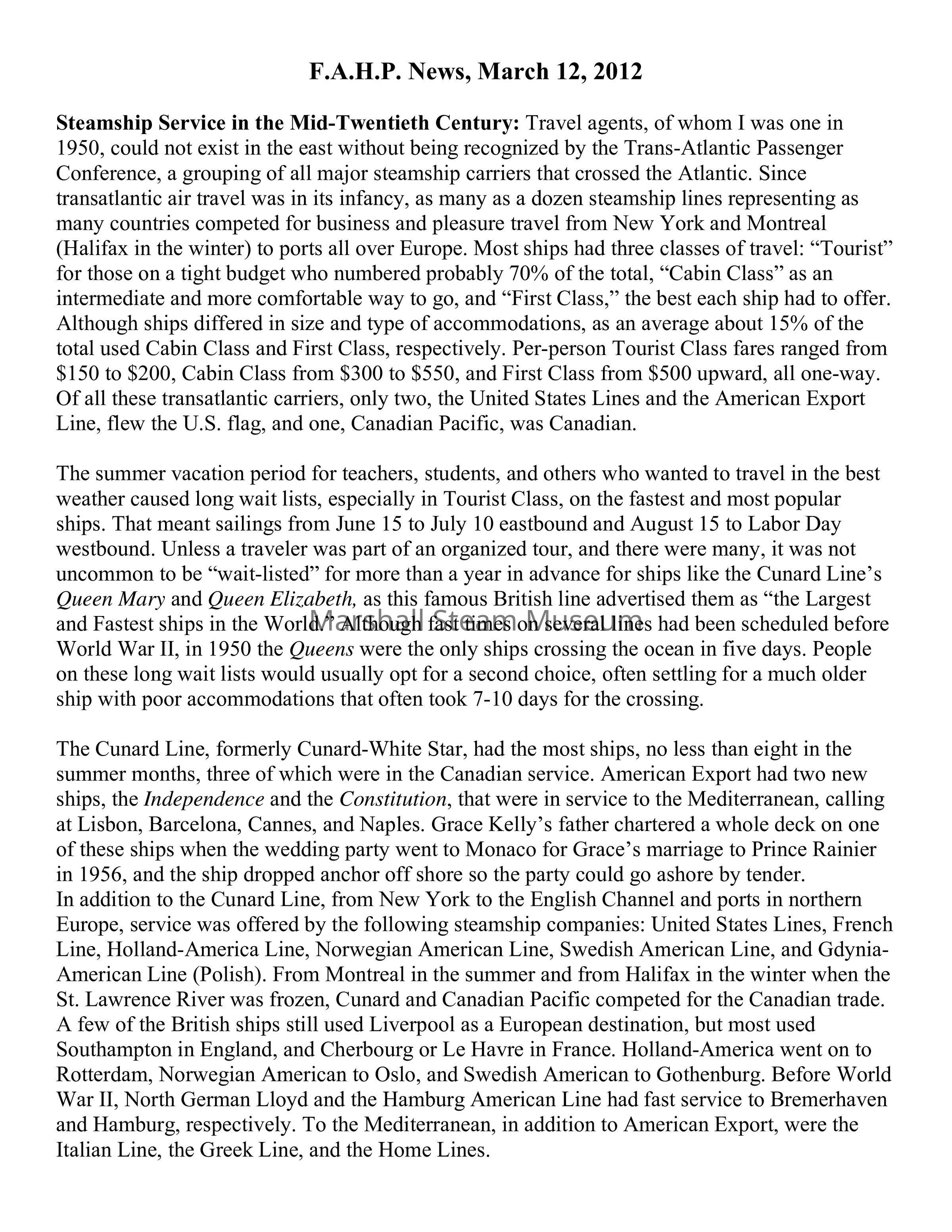 Steamship Service in the Mid-Twentieth Century: Travel agents, of whom I was one in 1950, could not exist in the east without being recognized by the Trans-Atlantic Passenger Conference, a grouping of all major steamship carriers that crossed the Atlantic. Since transatlantic air travel was in its infancy, as many as a dozen steamship lines representing as many countries competed for business and pleasure travel from New York and Montreal (Halifax in the winter) to ports all over Europe. Most ships had three classes of travel: “Tourist” for those on a tight budget who numbered probably 70% of the total, “Cabin Class” as an intermediate and more comfortable way to go, and “First Class,” the best each ship had to offer. Although ships differed in size and type of accommodations, as an average about 15% of the total used Cabin Class and First Class, respectively. Per-person Tourist Class fares ranged from $150 to $200, Cabin Class from $300 to $550, and First Class from $500 upward, all one-way. Of all these transatlantic carriers, only two, the United States Lines and the American Export Line, flew the U.S. flag, and one, Canadian Pacific, was Canadian.