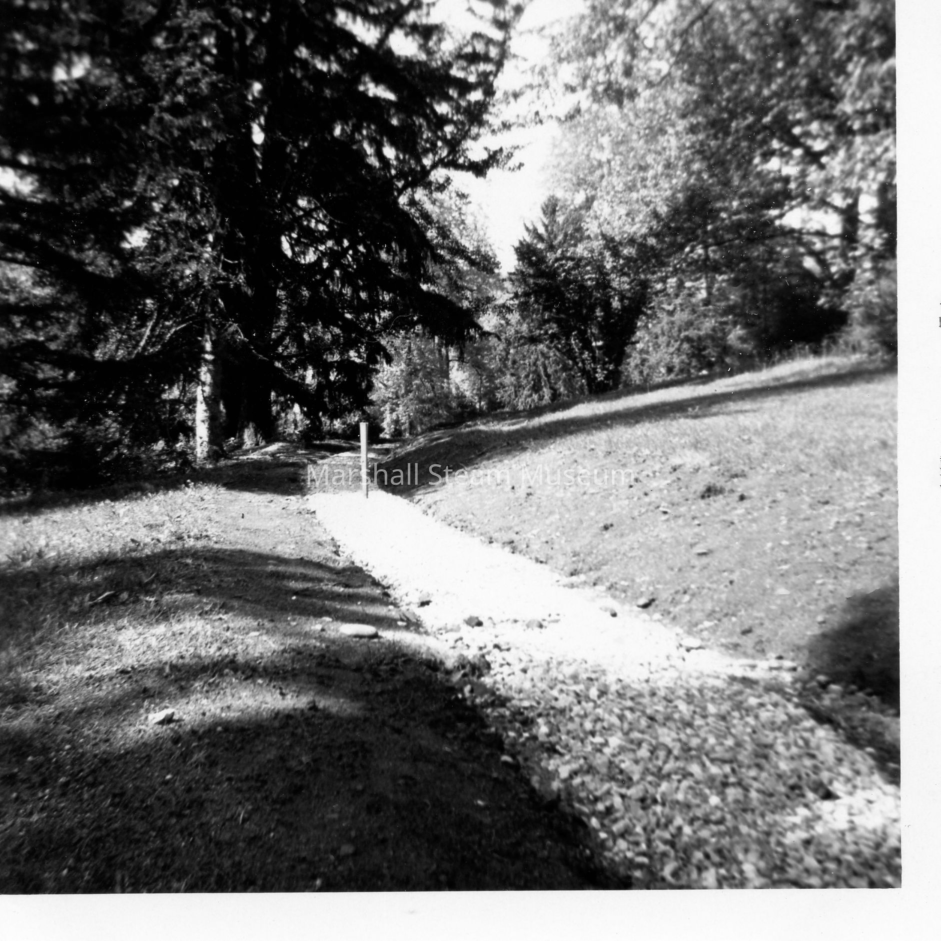 Backwriting: "The roadbed here is almost on the present driveway around the east side of the big house, is completed and ready for fine stone and the railroad sections. The grade here was about 3%"Photograph Details