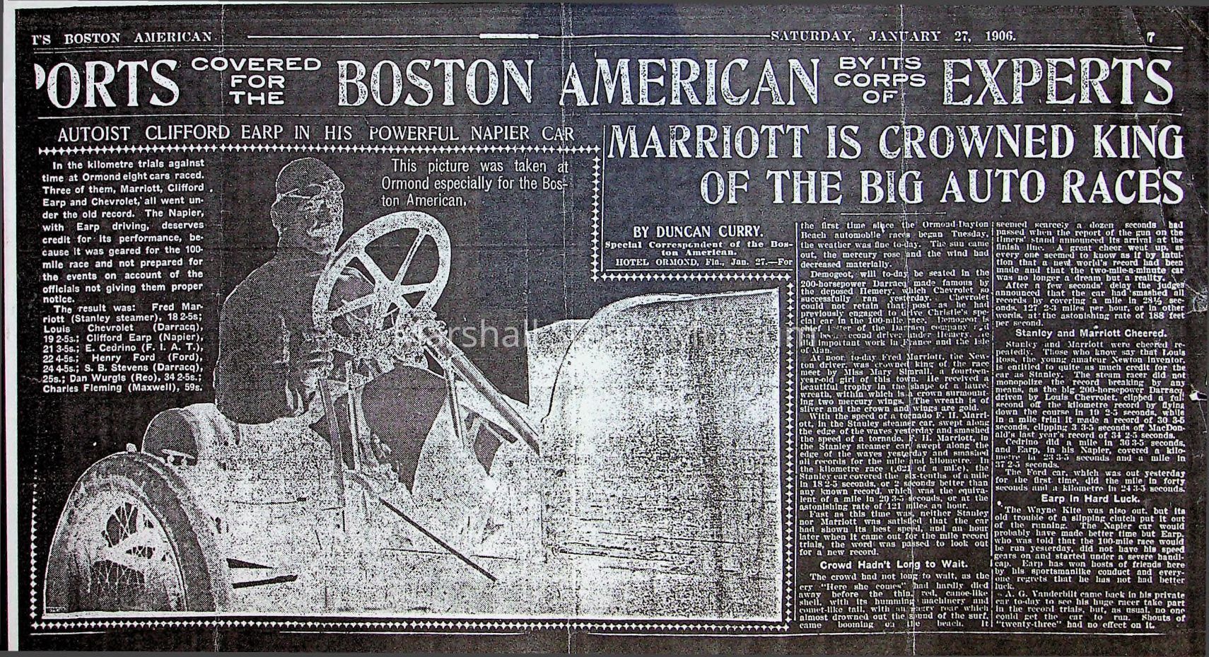 1906 article in Boston Globe regarding Fred Marriott speed record at Ormond Beach, FL