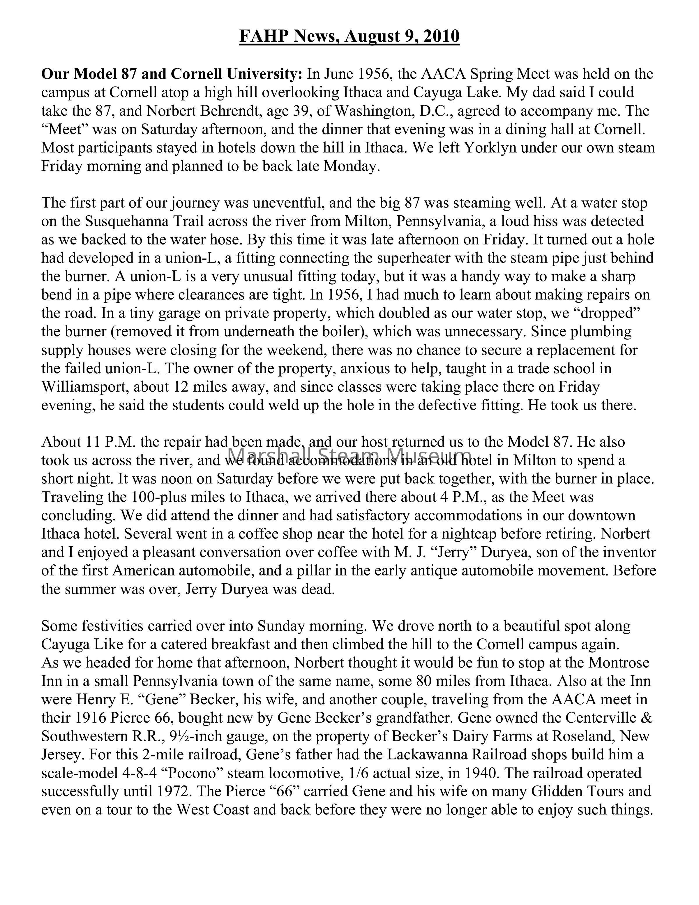 About 11 P.M. the repair had been made, and our host returned us to the Model 87. He also took us across the river, and we found accommodations in an old hotel in Milton to spend a short night. It was noon on Saturday before we were put back together, with the burner in place. Traveling the 100-plus miles to Ithaca, we arrived there about 4 P.M., as the Meet was concluding. We did attend the dinner and had satisfactory accommodations in our downtown Ithaca hotel. Several went in a coffee shop near the hotel for a nightcap before retiring. Norbert and I enjoyed a pleasant conversation over coffee with M. J. “Jerry” Duryea, son of the inventor of the first American automobile, and a pillar in the early antique automobile movement. Before the summer was over, Jerry Duryea was dead.