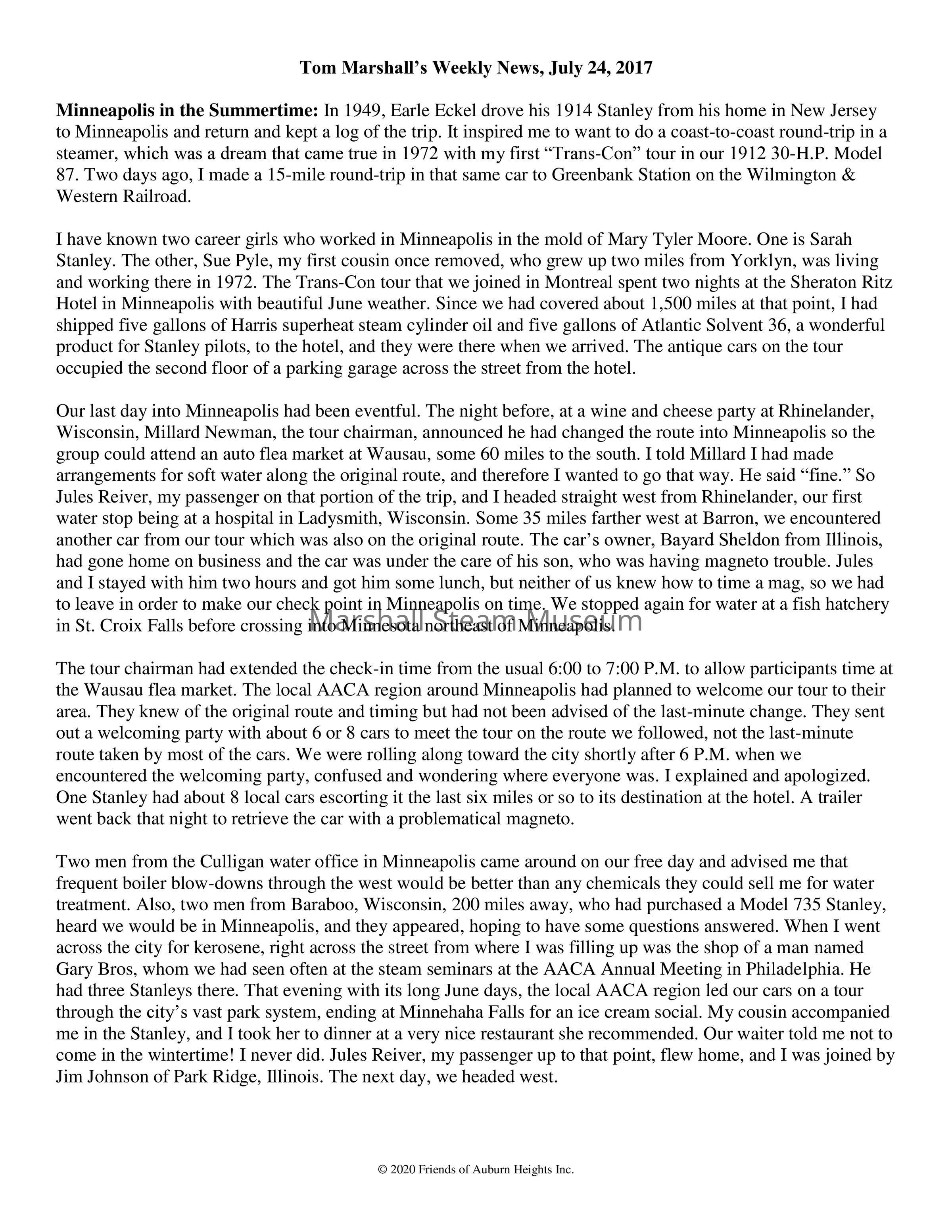 Our last day into Minneapolis had been eventful. The night before, at a wine and cheese party at Rhinelander, Wisconsin, Millard Newman, the tour chairman, announced he had changed the route into Minneapolis so the group could attend an auto flea market at Wausau, some 60 miles to the south. I told Millard I had made arrangements for soft water along the original route, and therefore I wanted to go that way. He said “fine.” So Jules Reiver, my passenger on that portion of the trip, and I headed straight west from Rhinelander, our first water stop being at a hospital in Ladysmith, Wisconsin. Some 35 miles farther west at Barron, we encountered another car from our tour which was also on the original route. The car’s owner, Bayard Sheldon from Illinois, had gone home on business and the car was under the care of his son, who was having magneto trouble. Jules and I stayed with him two hours and got him some lunch, but neither of us knew how to time a mag, so we had to leave in order to make our check point in Minneapolis on time. We stopped again for water at a fish hatchery in St. Croix Falls before crossing into Minnesota northeast of Minneapolis.