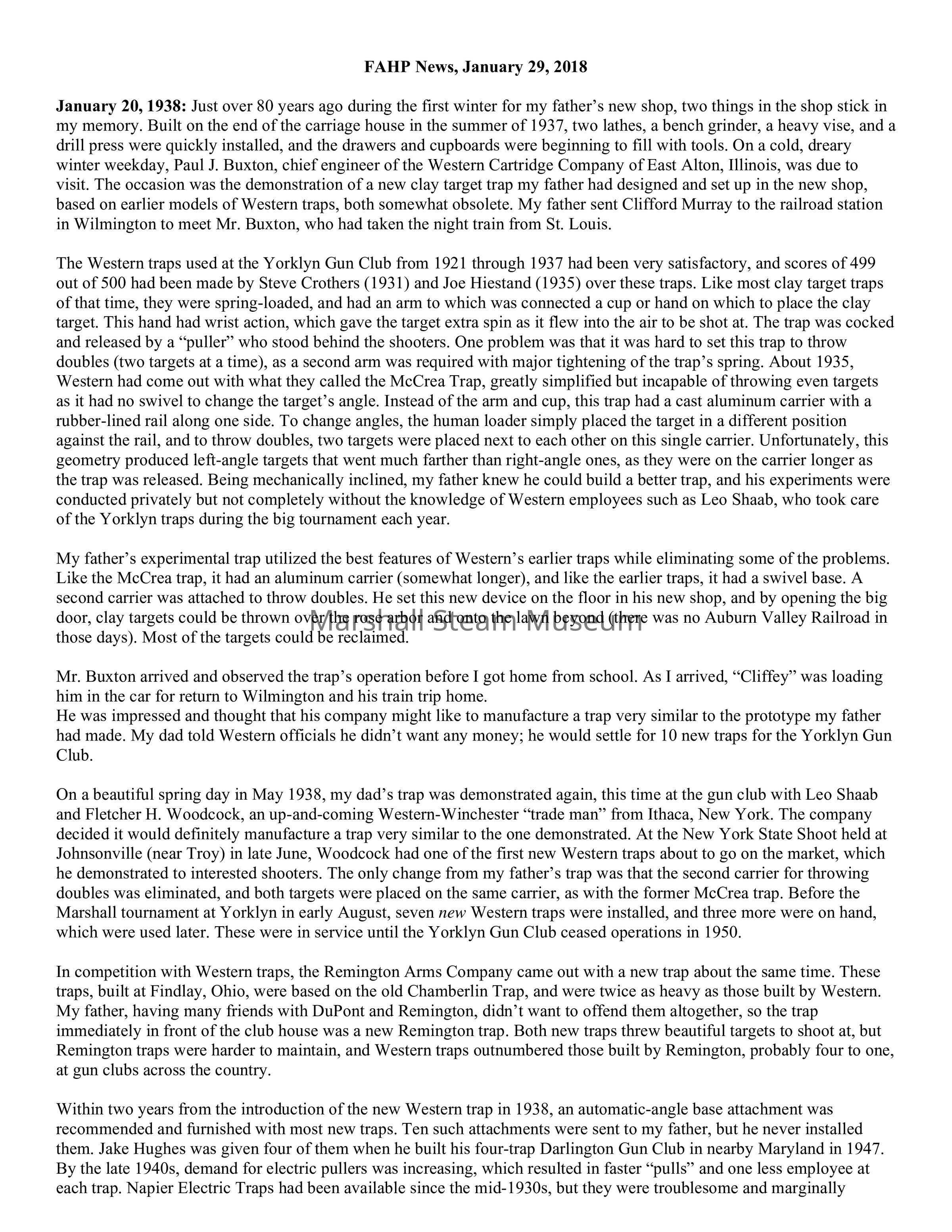 January 20, 1938: Just over 80 years ago during the first winter for my father’s new shop, two things in the shop stick in my memory. Built on the end of the carriage house in the summer of 1937, two lathes, a bench grinder, a heavy vise, and a drill press were quickly installed, and the drawers and cupboards were beginning to fill with tools. On a cold, dreary winter weekday, Paul J. Buxton, chief engineer of the Western Cartridge Company of East Alton, Illinois, was due to visit. The occasion was the demonstration of a new clay target trap my father had designed and set up in the new shop, based on earlier models of Western traps, both somewhat obsolete. My father sent Clifford Murray to the railroad station in Wilmington to meet Mr. Buxton, who had taken the night train from St. Louis.