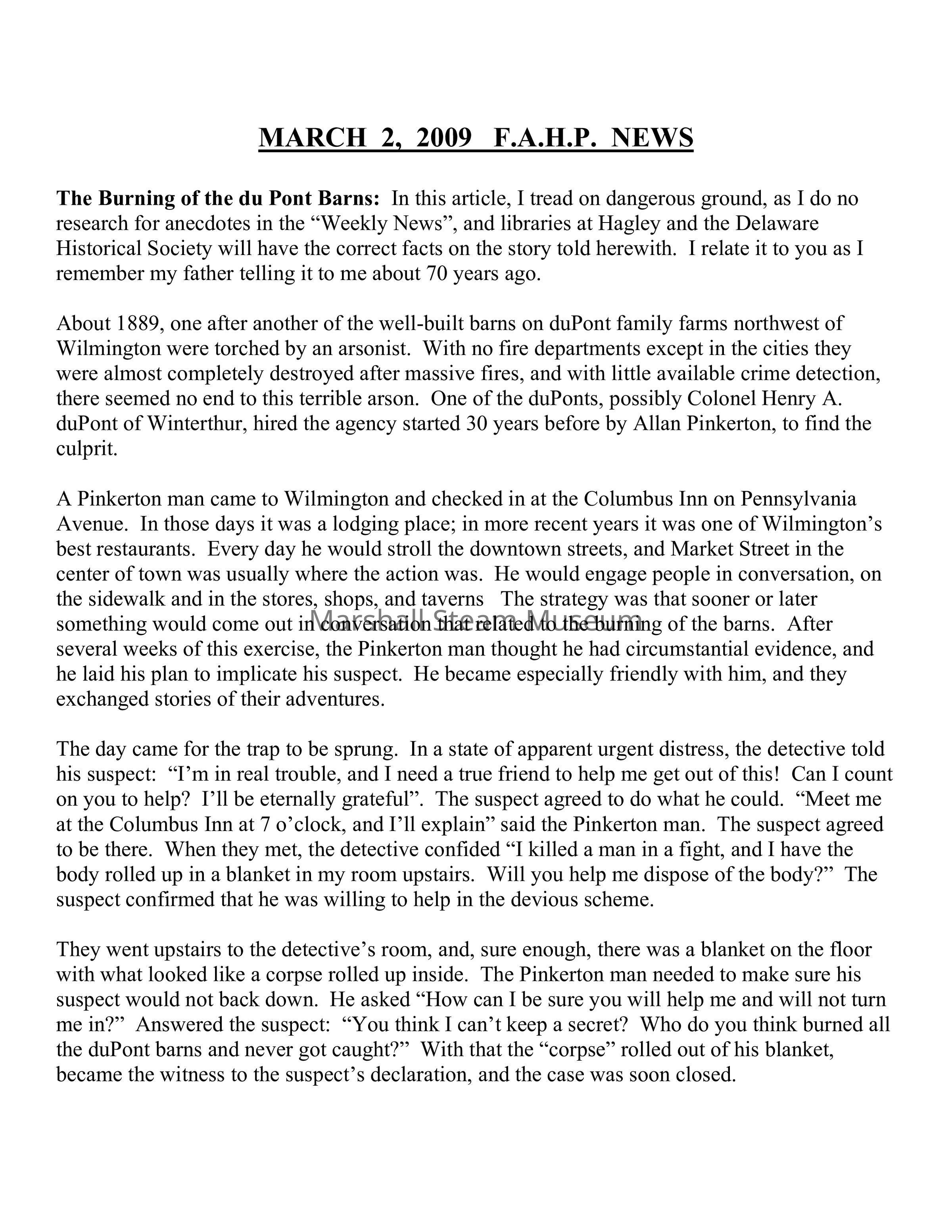 The Burning of the du Pont Barns: In this article, I tread on dangerous ground, as I do no research for anecdotes in the “Weekly News”, and libraries at Hagley and the Delaware Historical Society will have the correct facts on the story told herewith. I relate it to you as I remember my father telling it to me about 70 years ago.